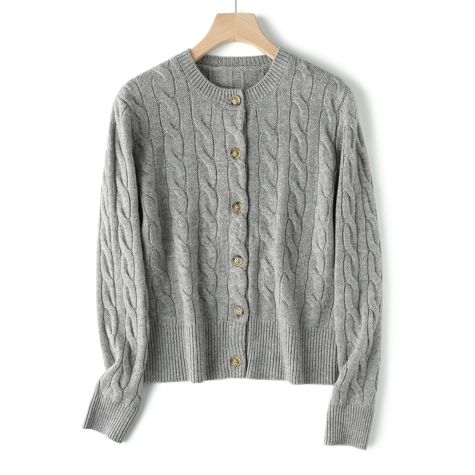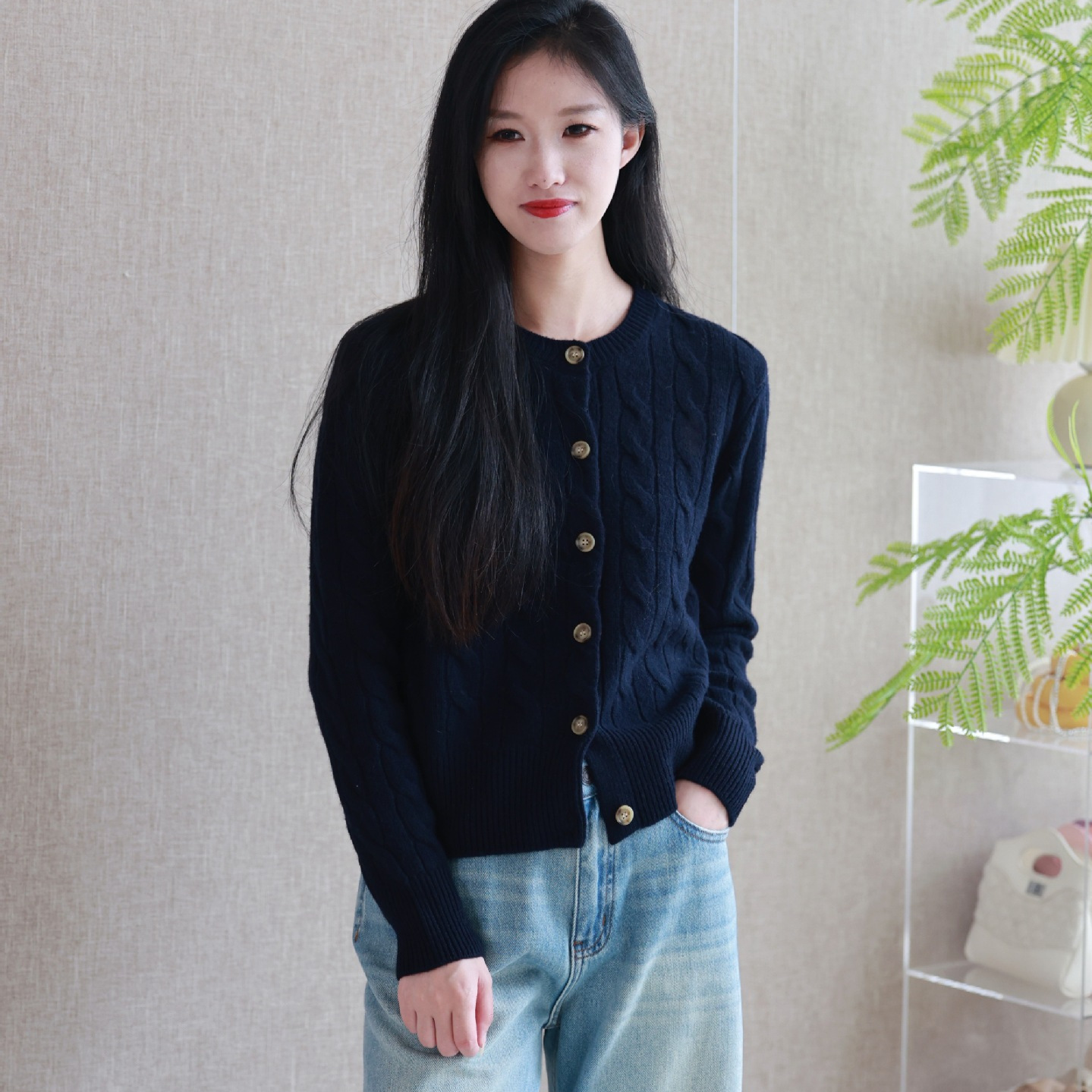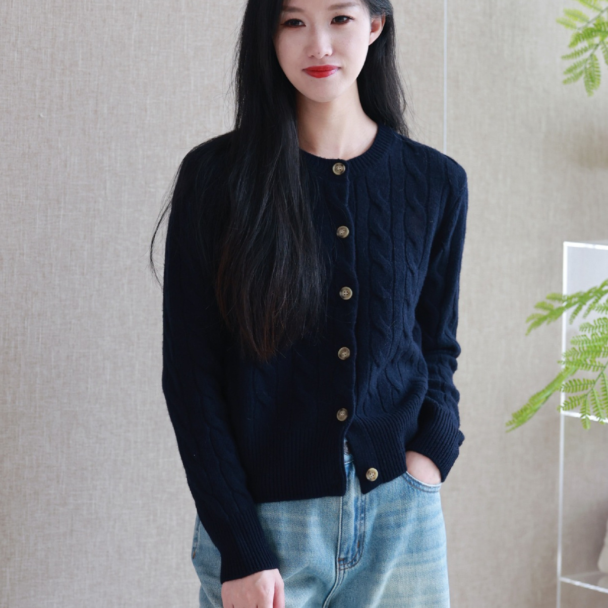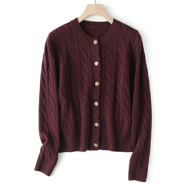 复古绞花100%美丽诺羊毛针织开衫百搭学院风圆领厚毛衣外套秋冬女