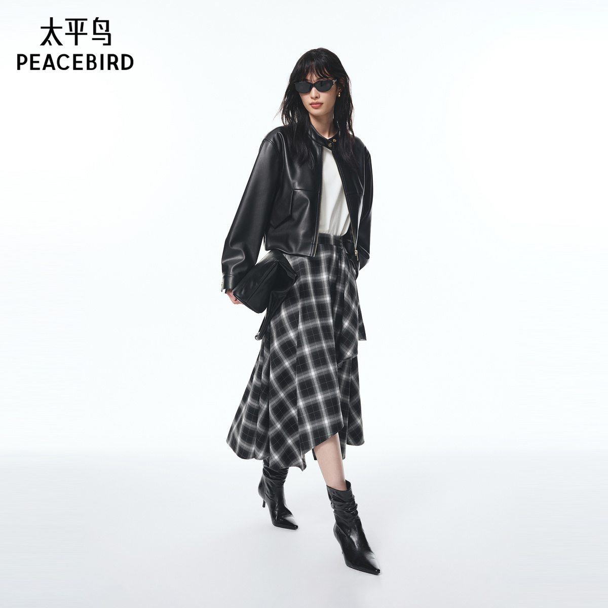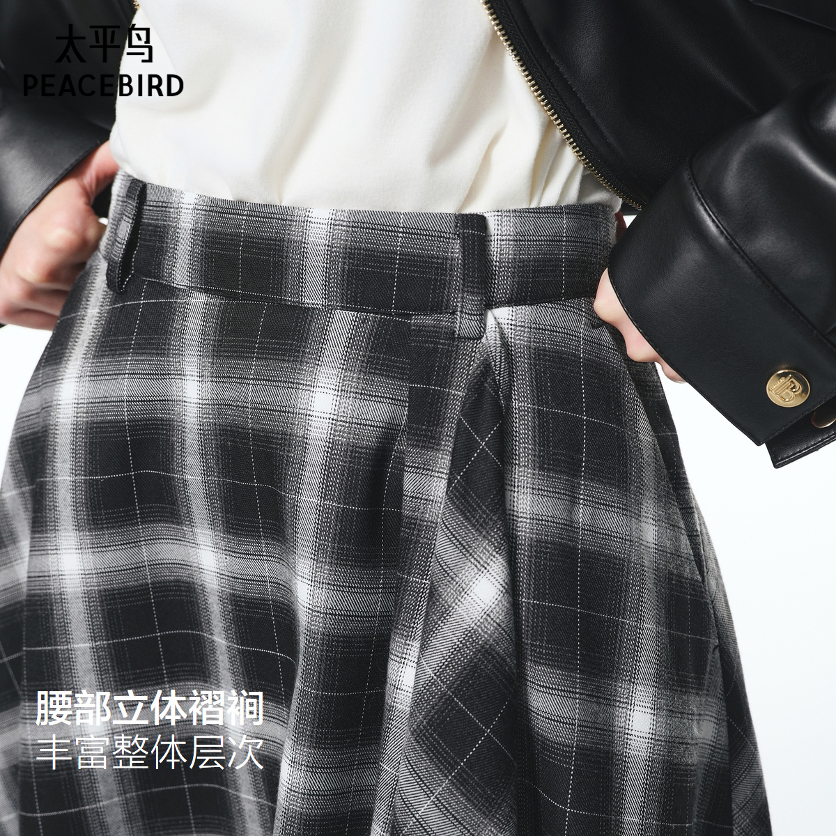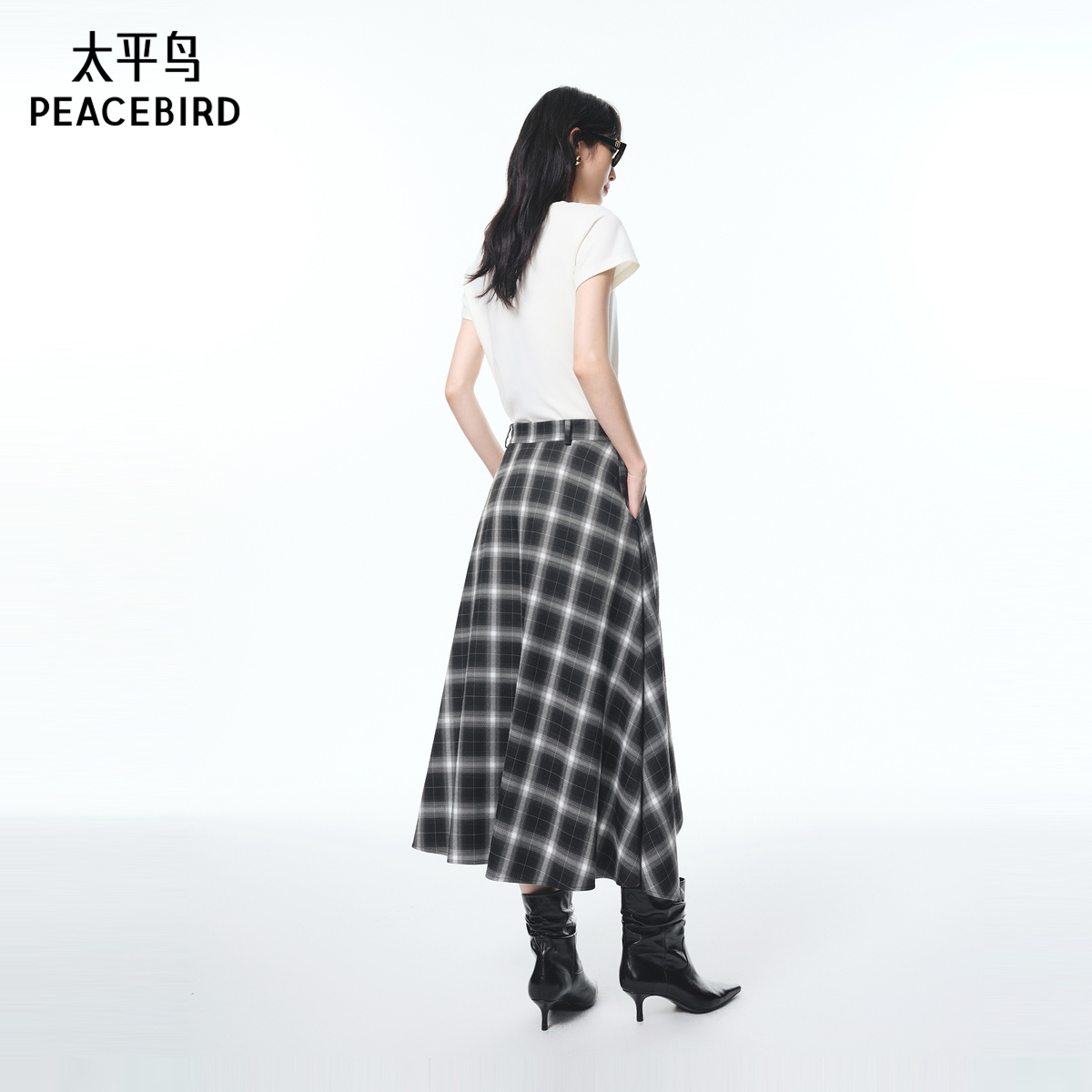 太平鸟黑色格纹格子半身裙秋季新款长裙不规则飘逸伞裙半身裙长款