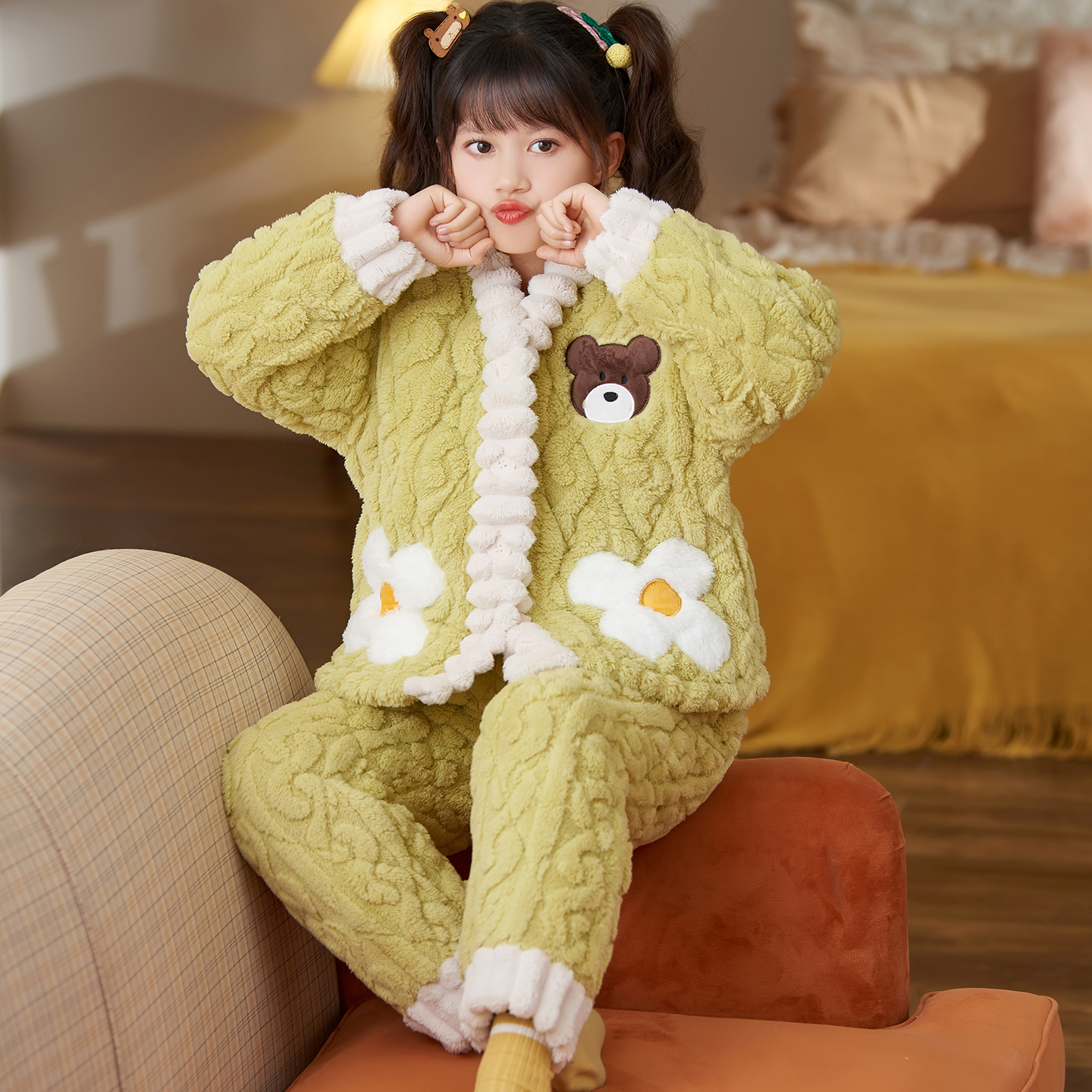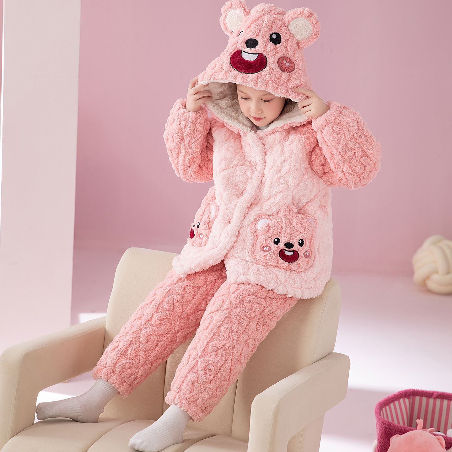 三层夹棉女童睡衣冬季加厚珊瑚绒中小大童女孩保暖连帽家居服套装