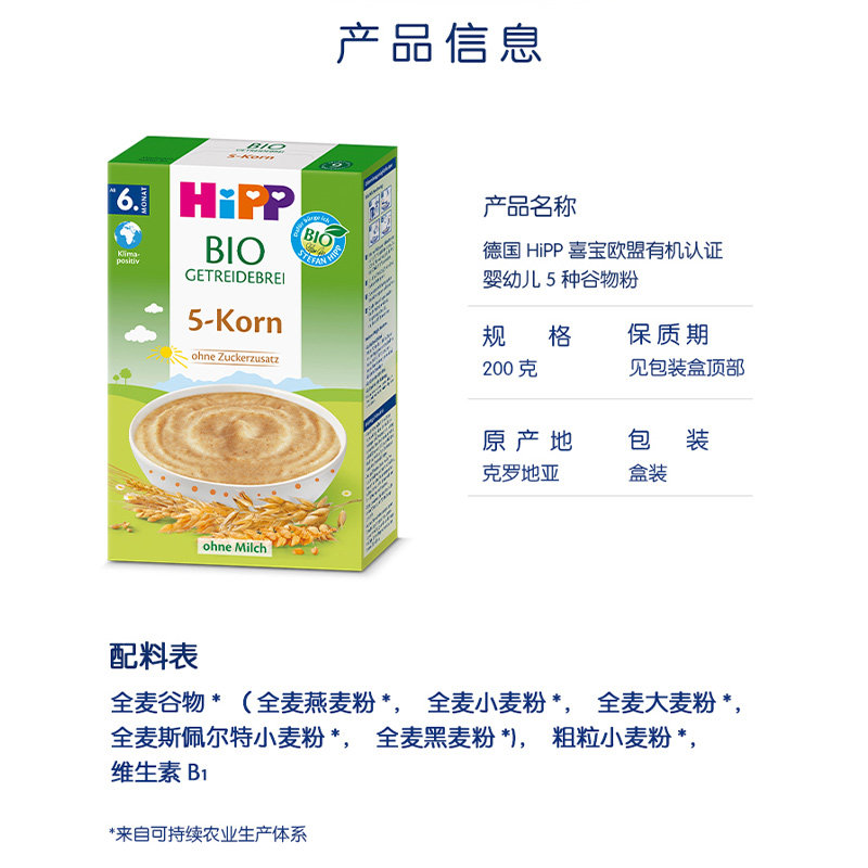 【自营】HiPP喜宝有机婴幼儿5种谷物粉 200g/盒