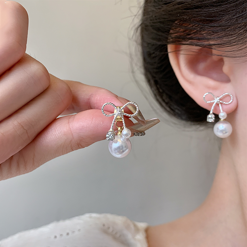 蝴蝶结珍珠锆石耳钉女轻奢高级感小众设计耳环2024新款两戴式耳饰