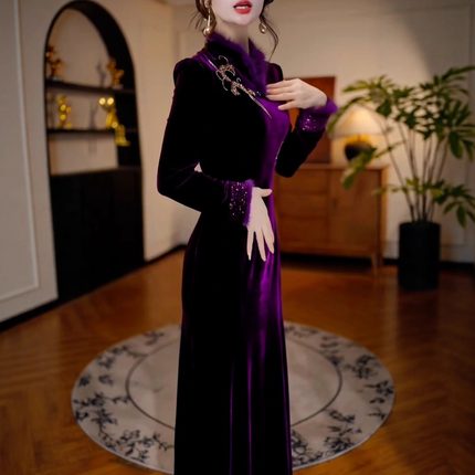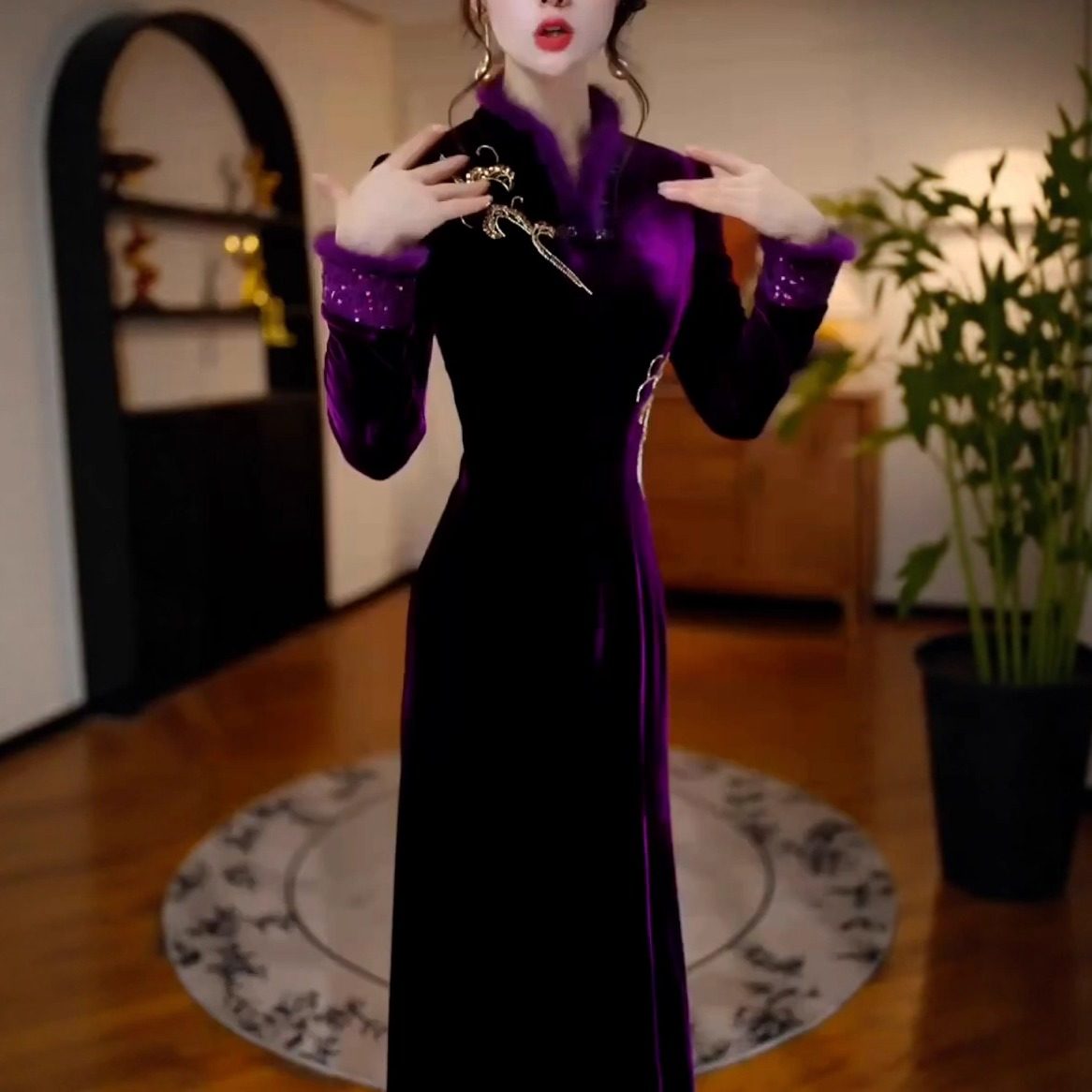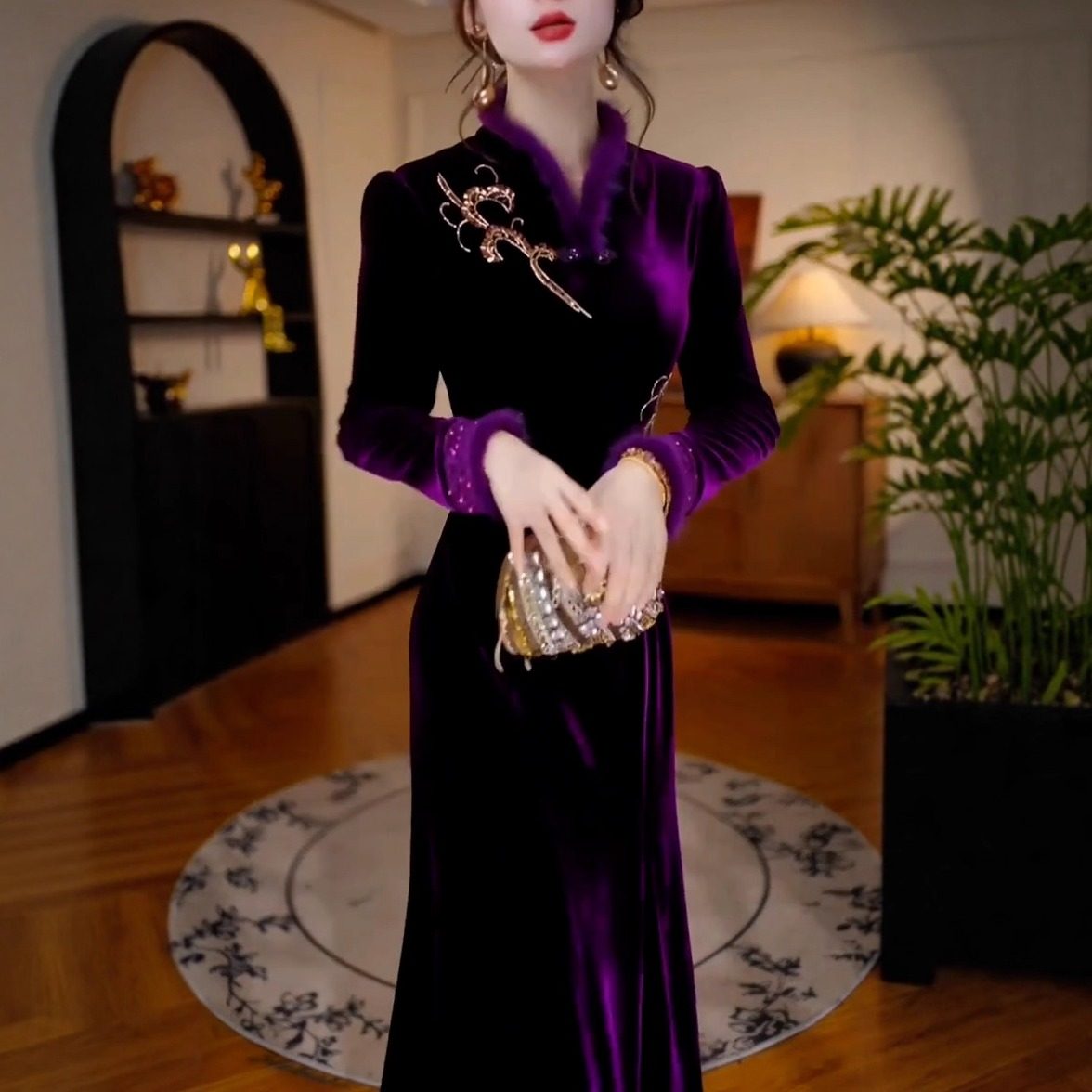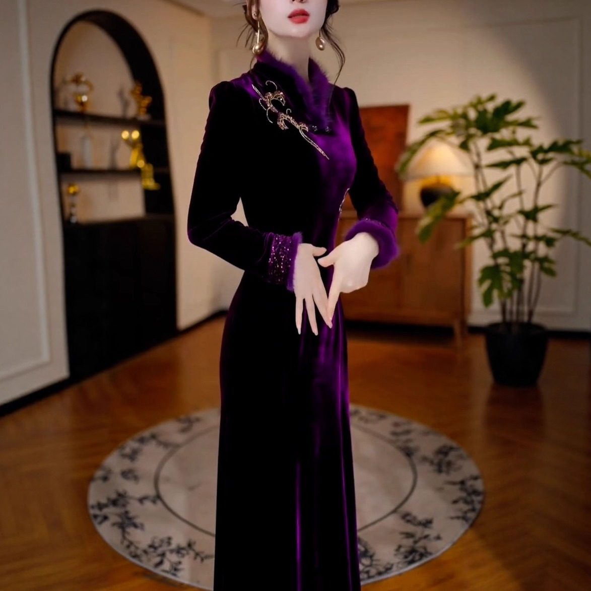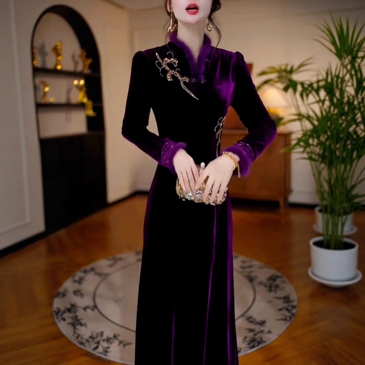 秋冬新款高端新中式国风复古重工珠片刺绣改良旗袍气质优雅连衣裙