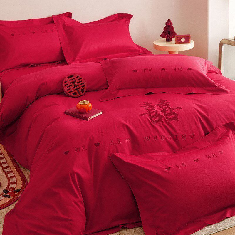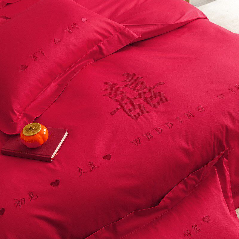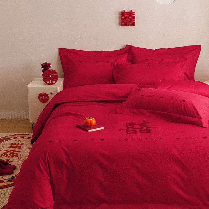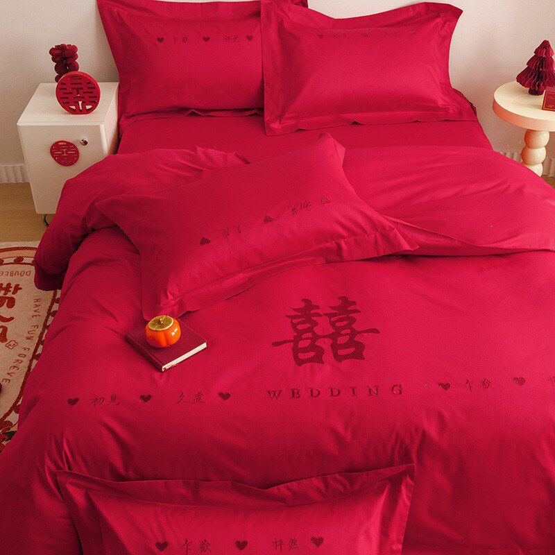 HIINII高端结婚四件套大红色刺绣婚房婚庆喜被套喜庆床单床上用品