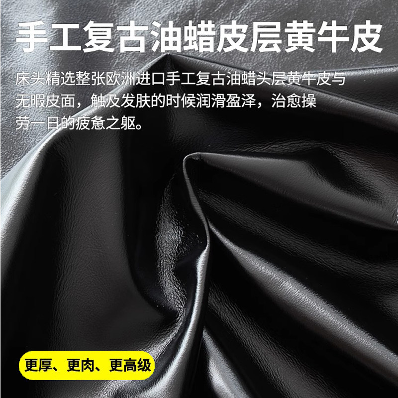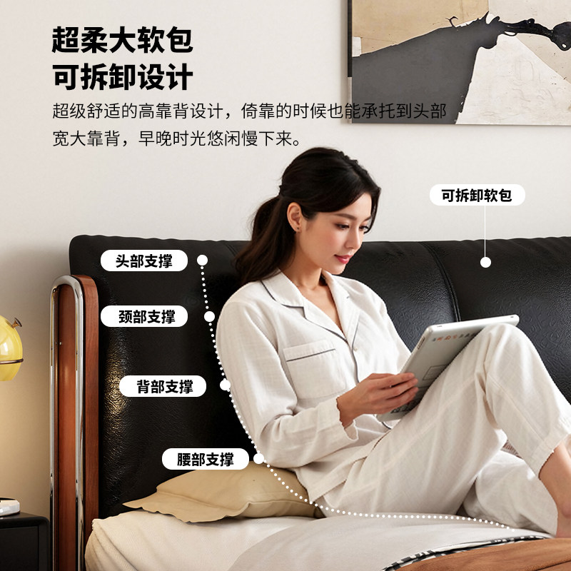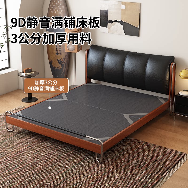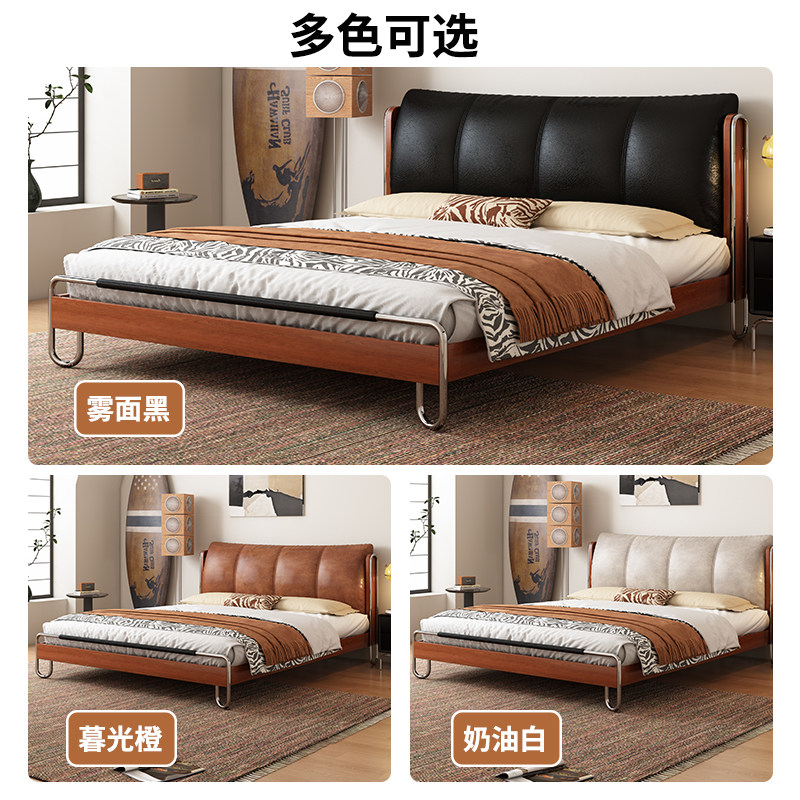 景开家具流影床中古风真皮实木家用卧室包豪斯复古软包床主卧婚床