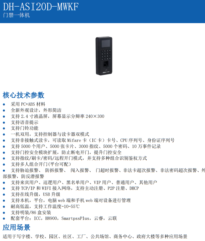指纹密码门禁考勤一体机IC刷卡WiFi远程开门大华DH-ASI20D-MWKF
