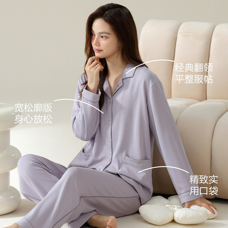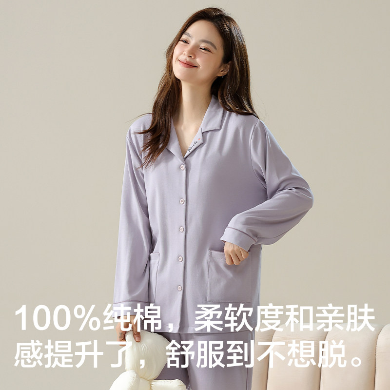 恒源祥全棉睡衣女纯色翻领长袖长裤两件套春夏休闲简约开衫家居服