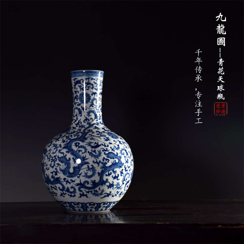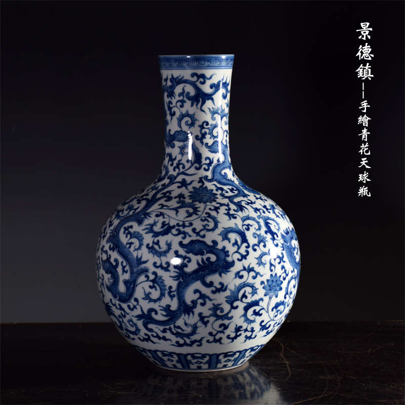 景德镇陶瓷器花瓶 青花天球瓶客厅摆件仿古简约台面装饰手工艺品
