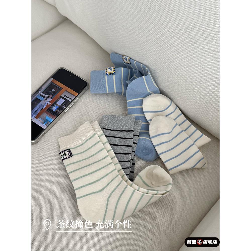 蓝色袜子女秋季薄款纯棉布标条纹中筒袜ins潮日系韩版学院风长袜