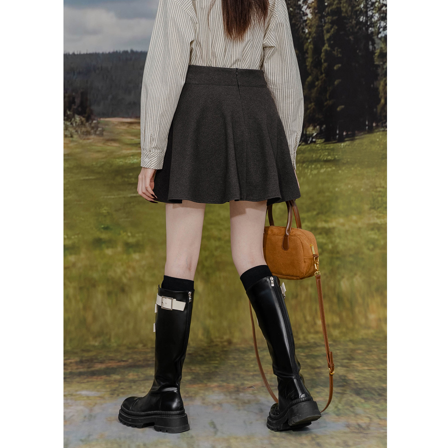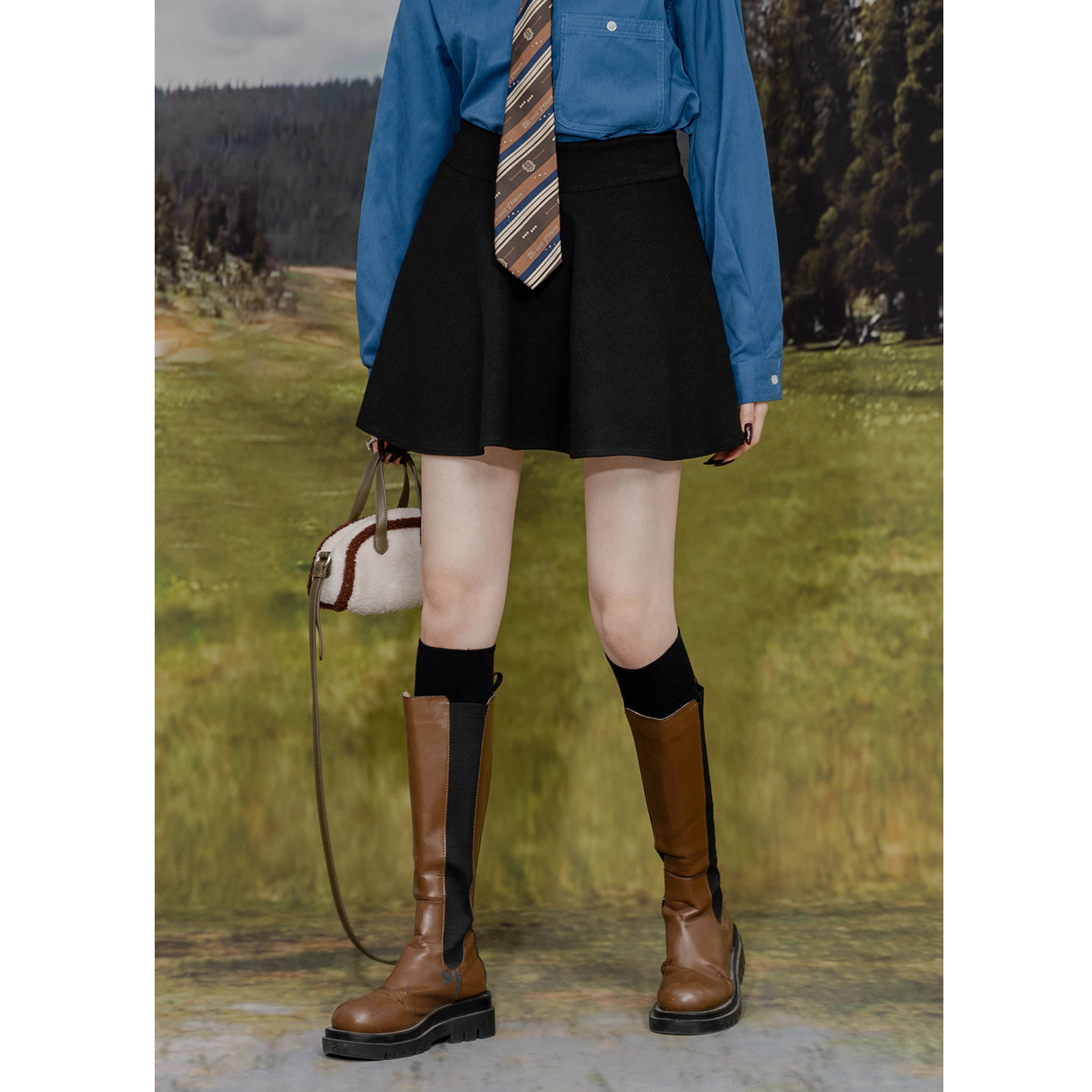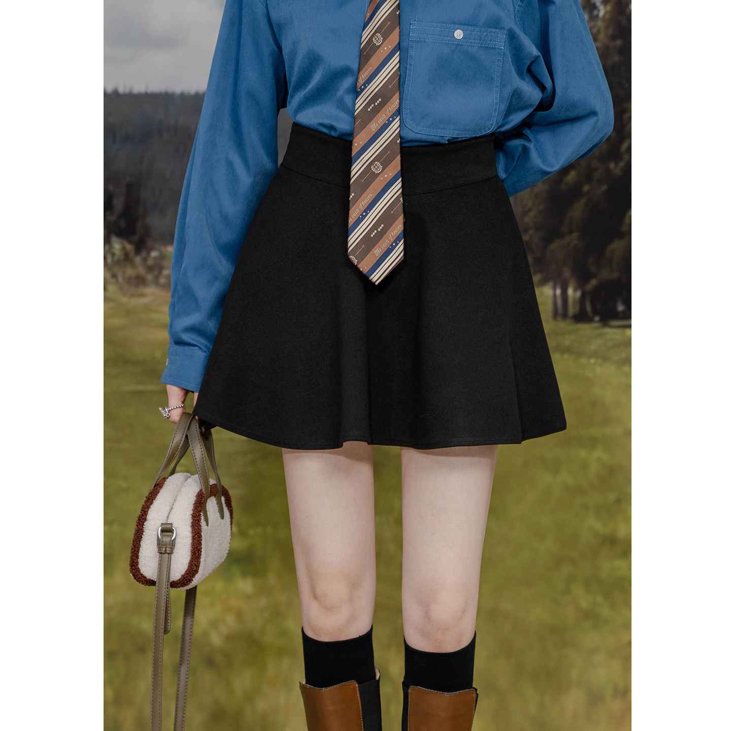 复古高腰毛呢短裙女防走光内衬简约百搭A字大摆荷叶边呢子半身裙