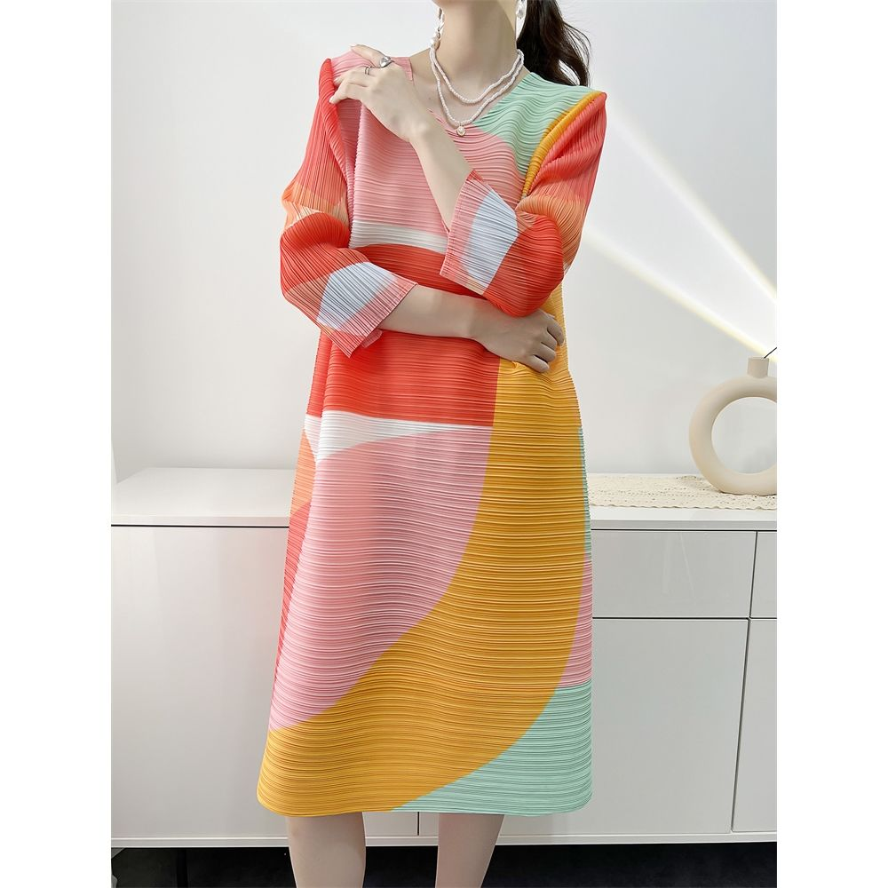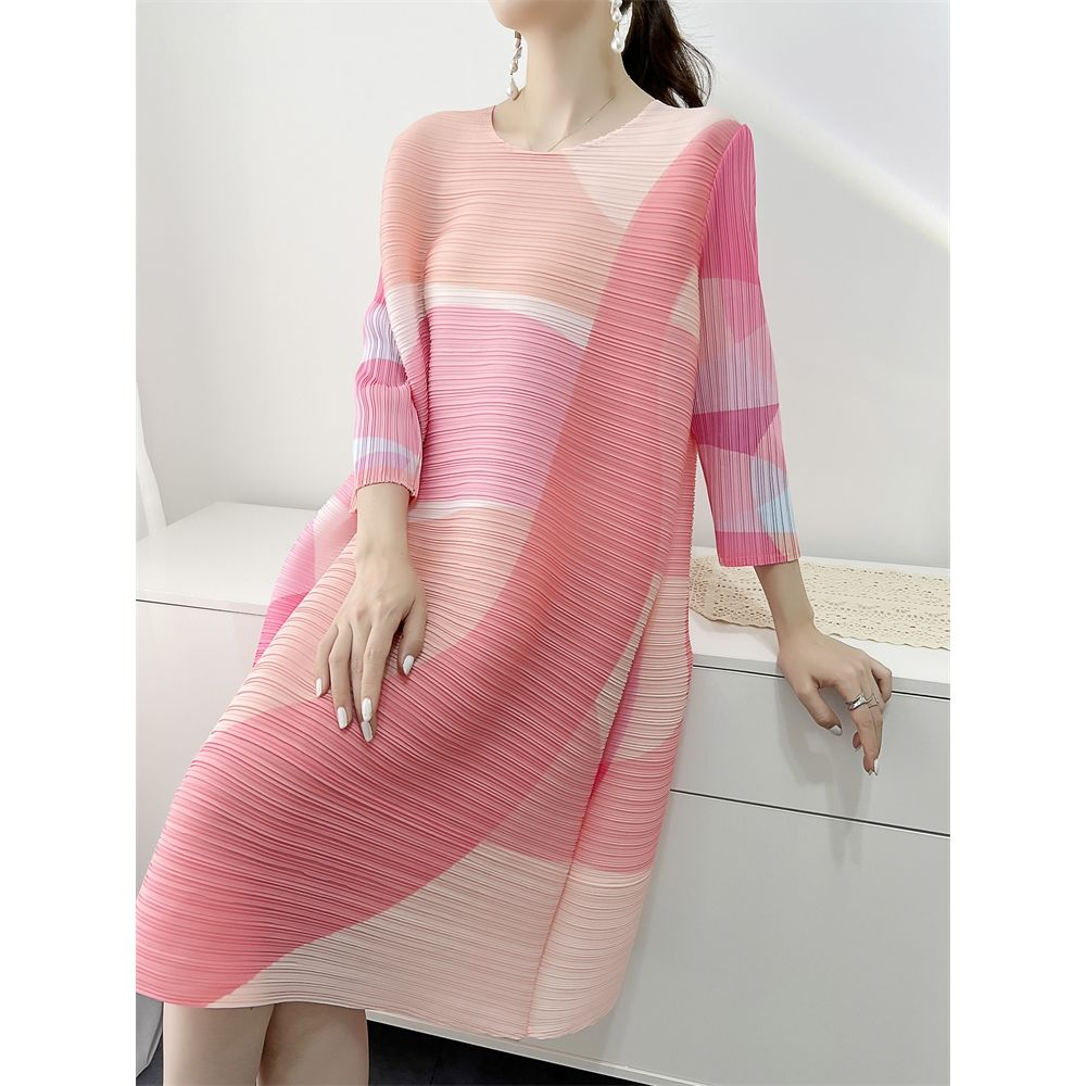 印花宅褶皱连衣裙夏季减龄大码洋气宽松显瘦2025年中长款女裙子三