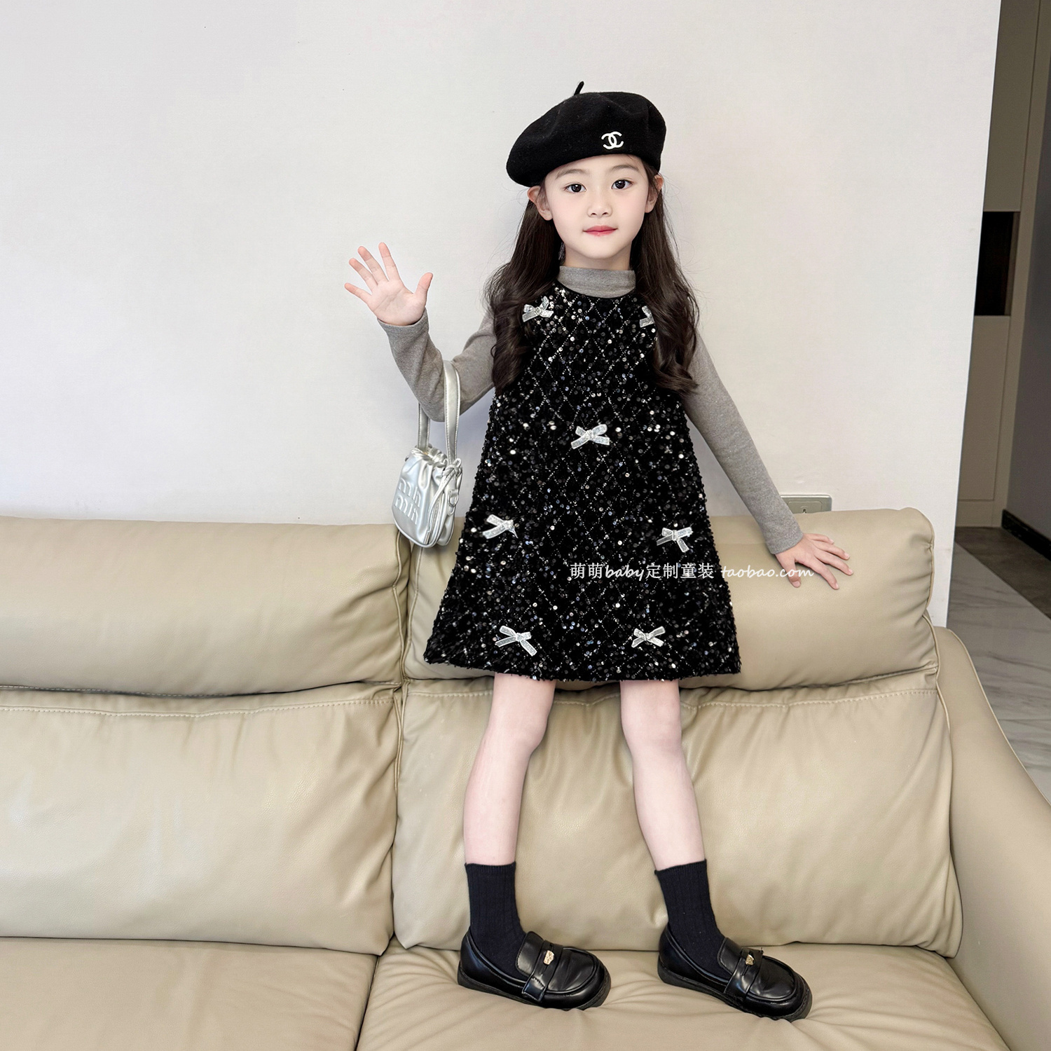 女童黑色丝绒亮片蝴蝶结加绒背心裙2025秋冬新款女孩闪闪连衣裙子