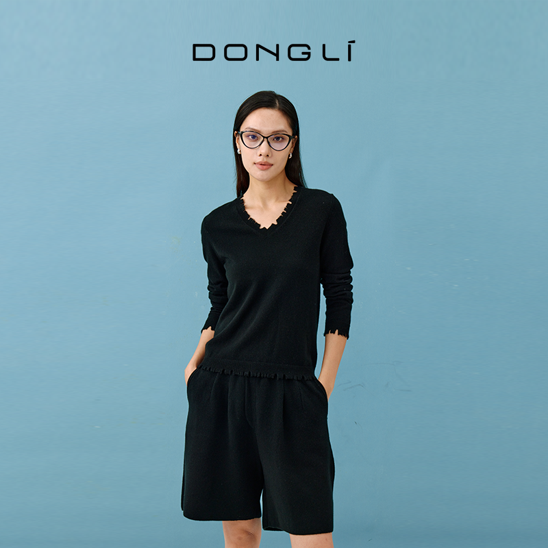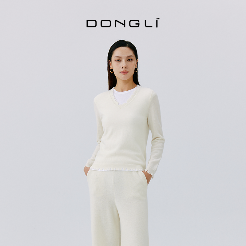东黎 溯源款 山羊绒 春秋锯齿边女士V领羊绒打底针织套衫毛衣4542