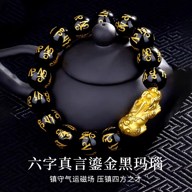 中国黄金央创貔貅手串男款六字箴言黑曜石手链生日礼物送男友S925