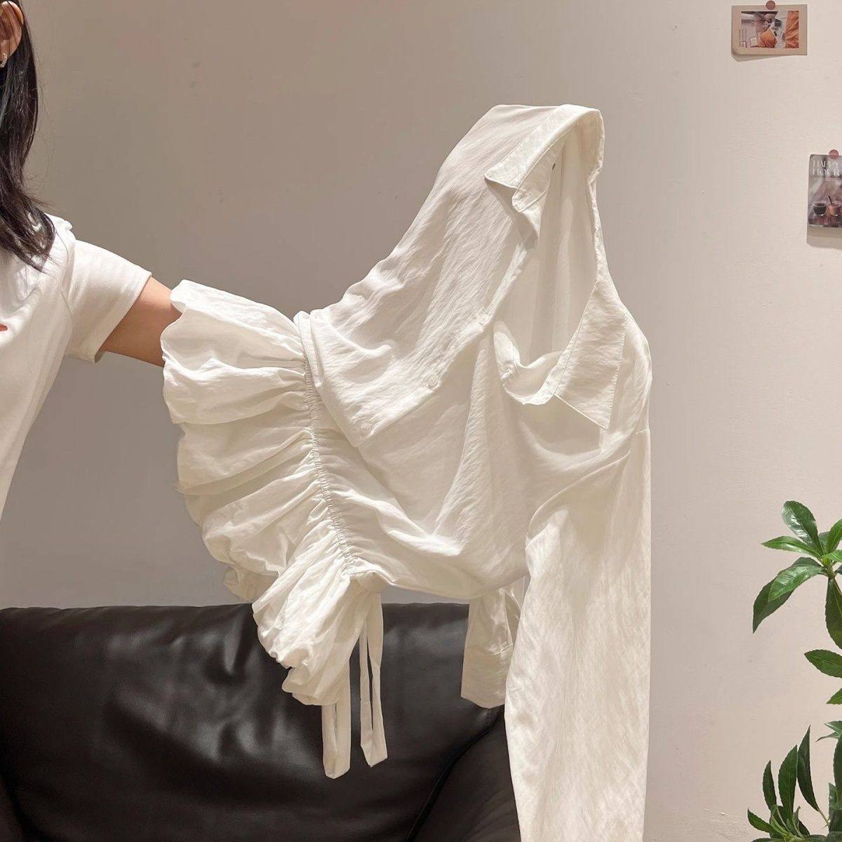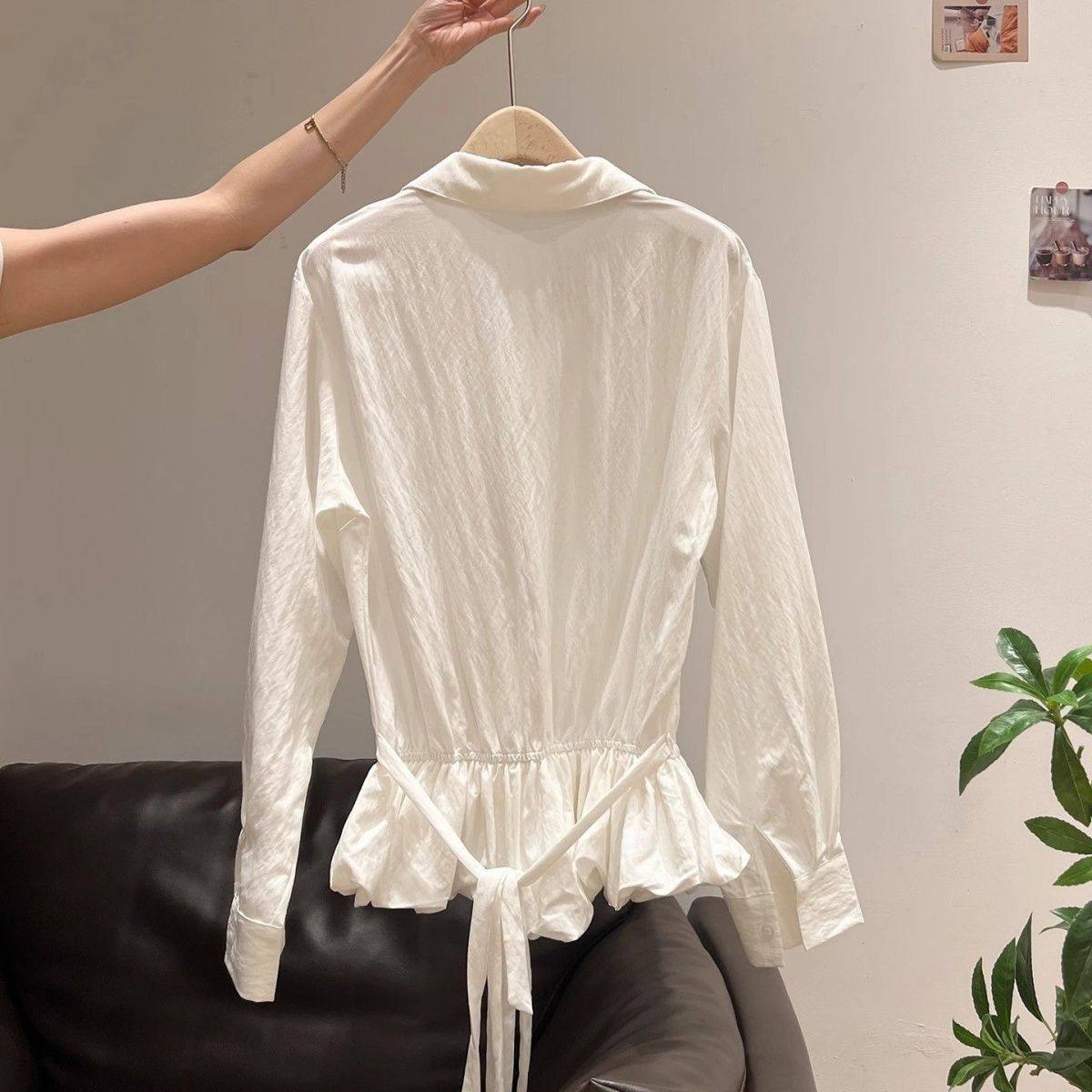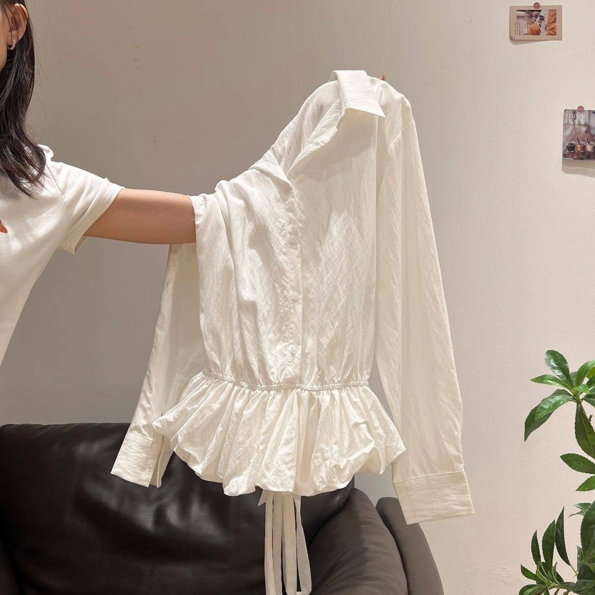 白色POLO领花苞下摆长袖衬衫女2025年秋季设计感褶皱收腰气质上衣