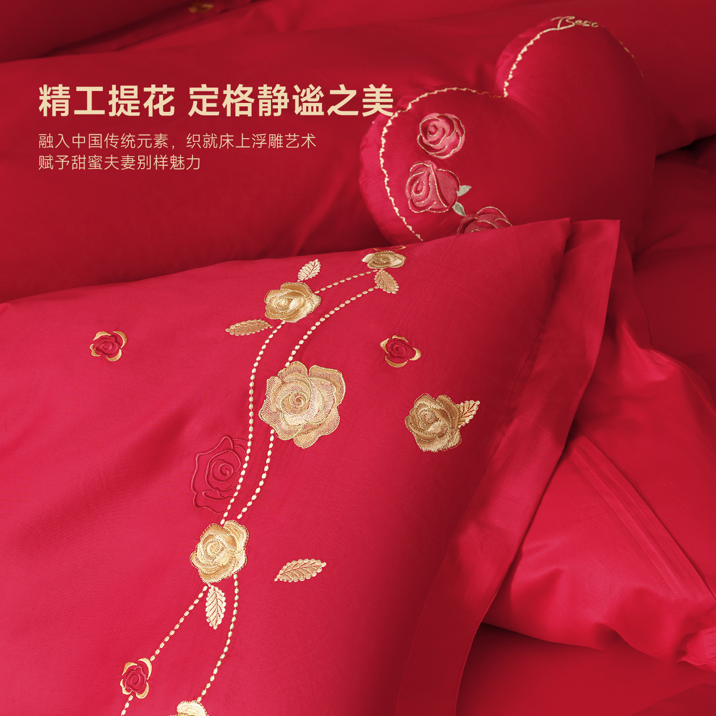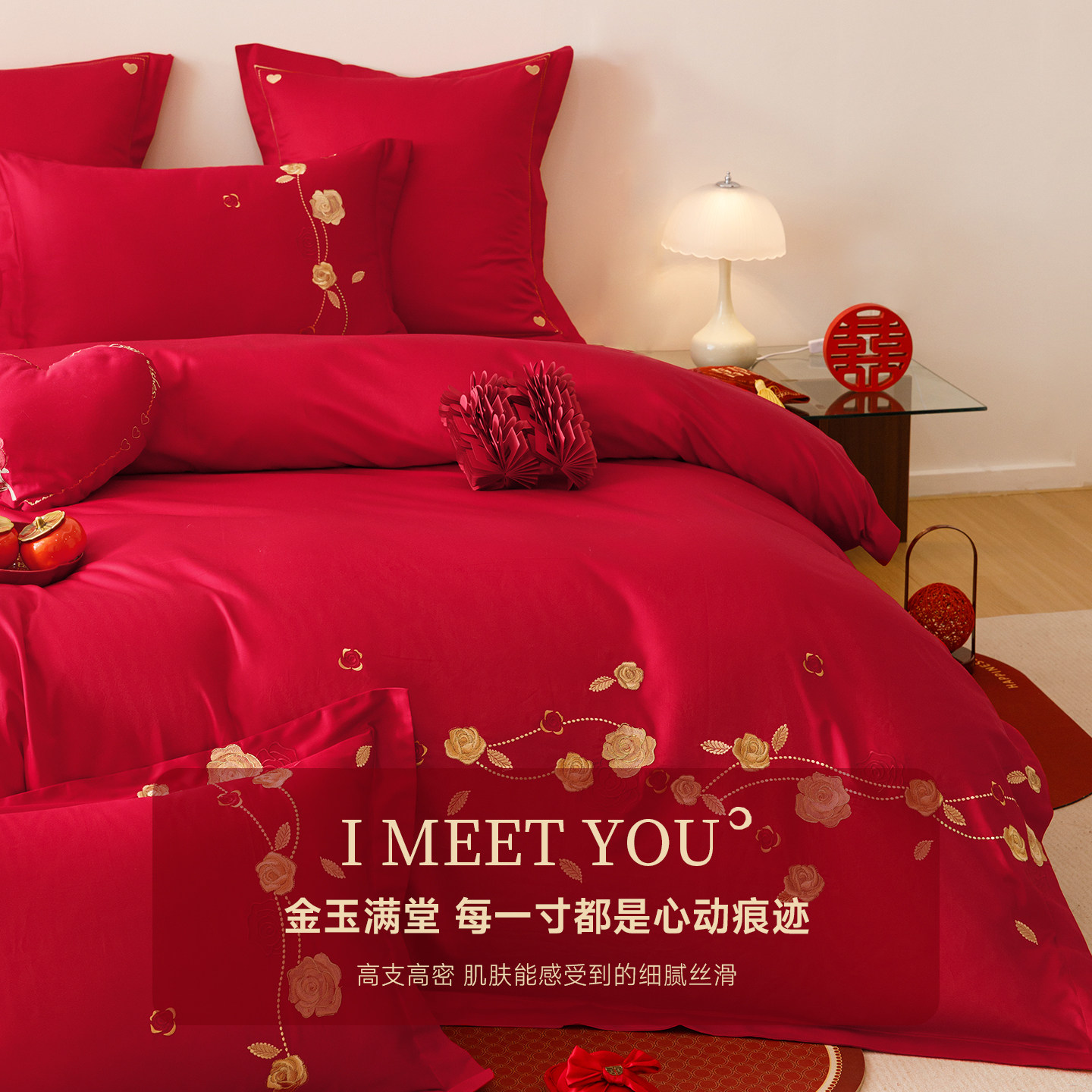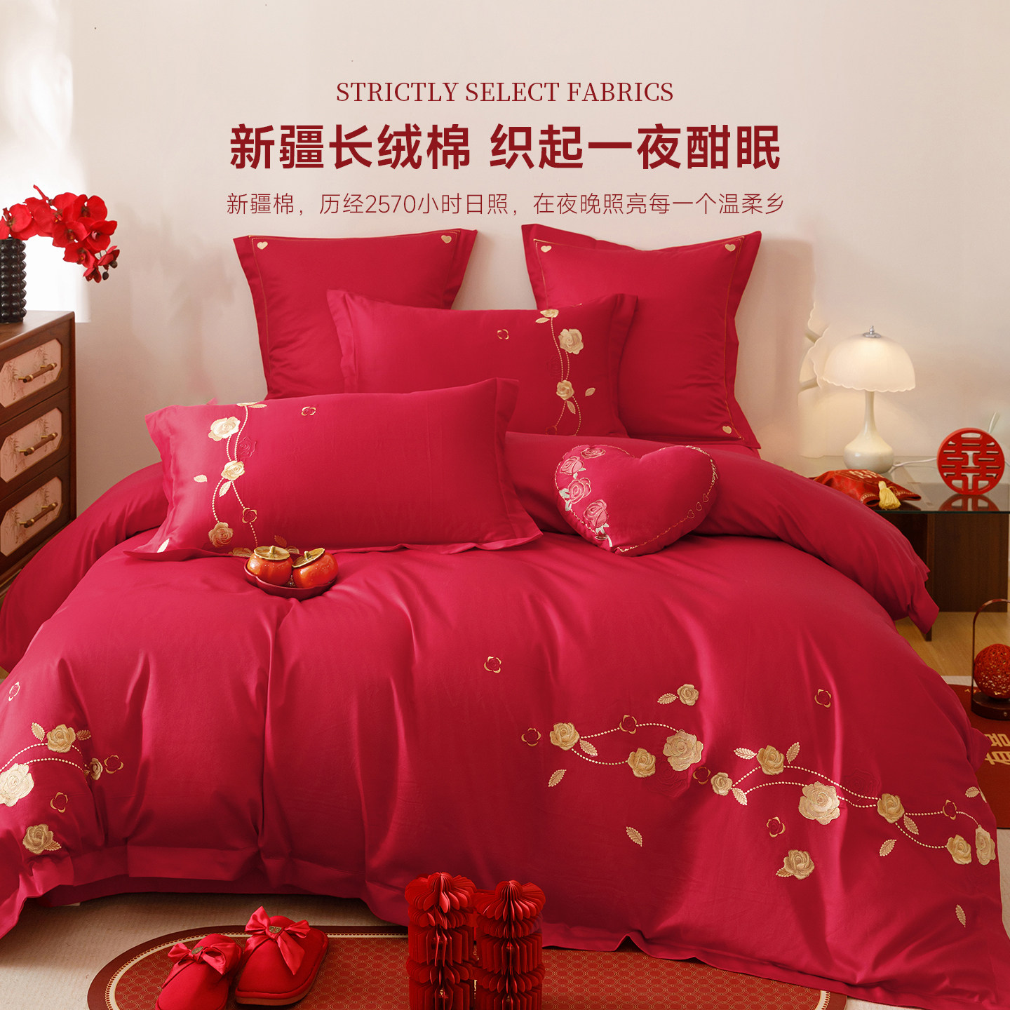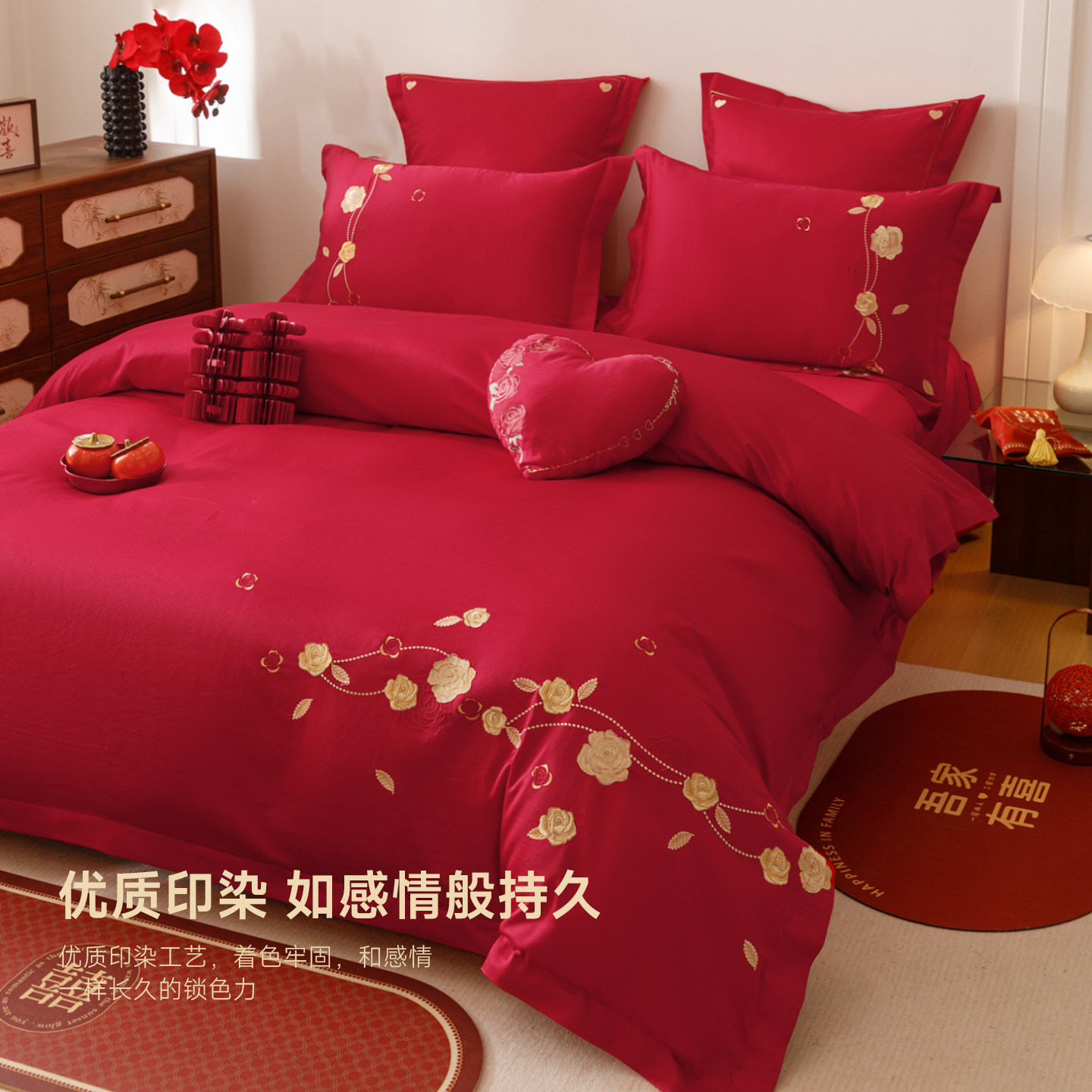 红豆婚庆四件套全棉喜庆结婚床上用品纯棉大红刺绣被套床单新婚嫁