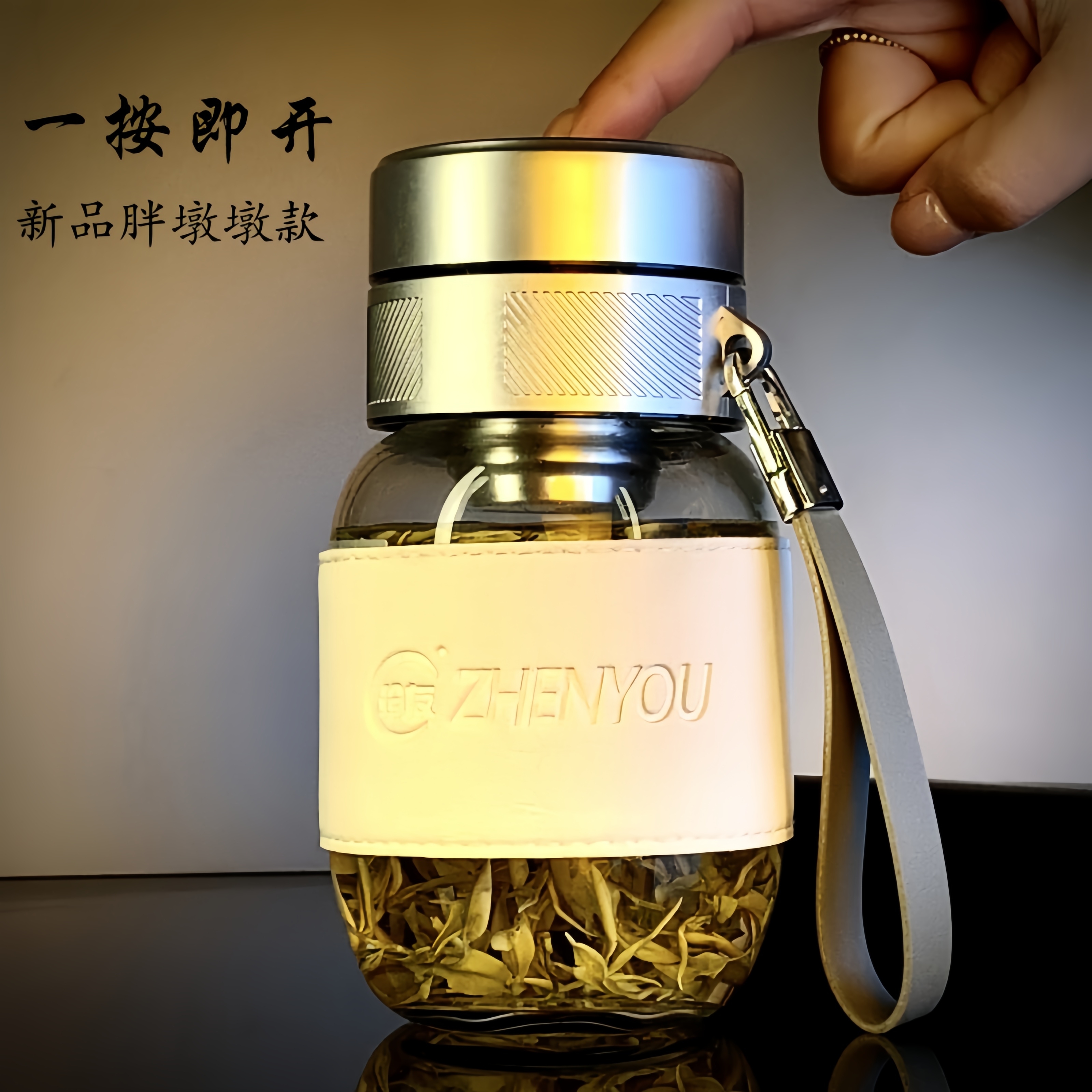 珍友新款加厚高硼硅玻璃杯一键开盖水杯胖胖大肚茶水分离泡茶杯子