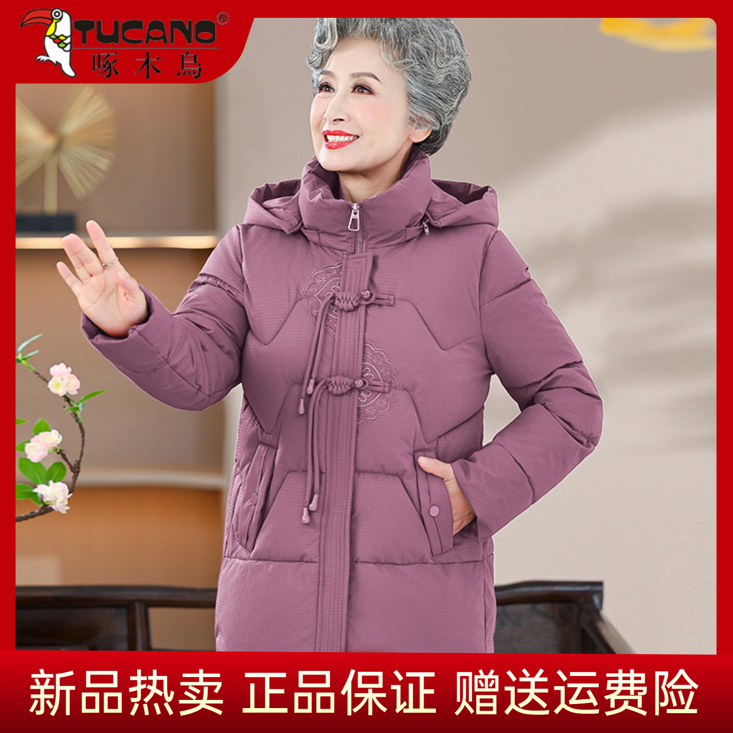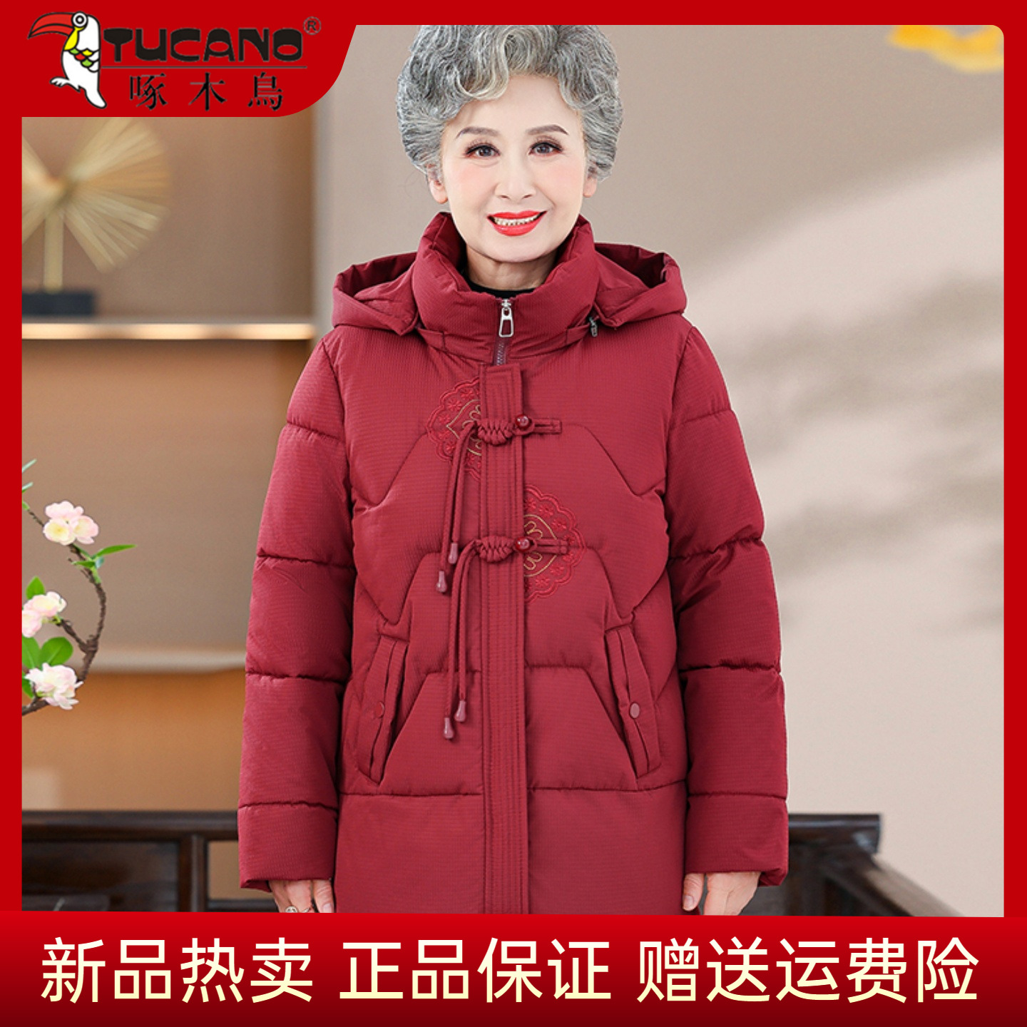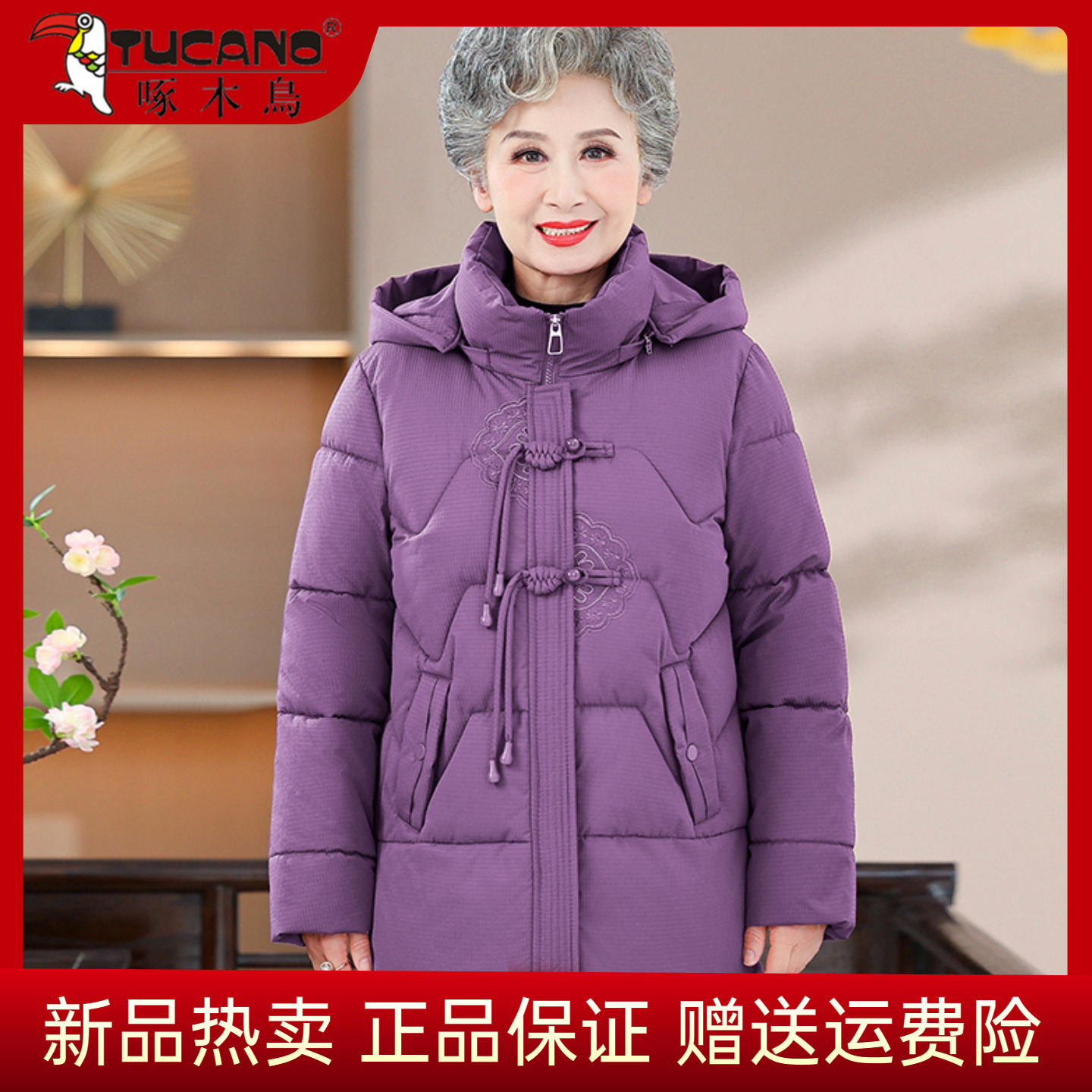 啄木鸟冬装奶奶加绒加厚高档棉服60岁中老年人时尚保暖连帽棉衣女