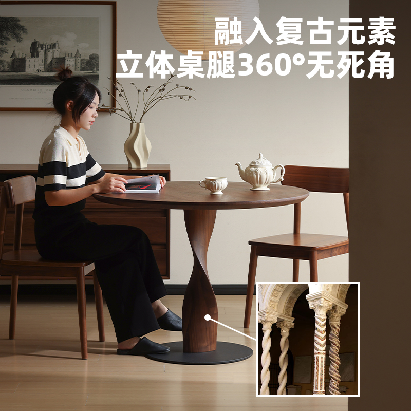 玄素家居北美黑胡桃实木圆形餐桌复古风圆桌小户型中古休闲饭桌子
