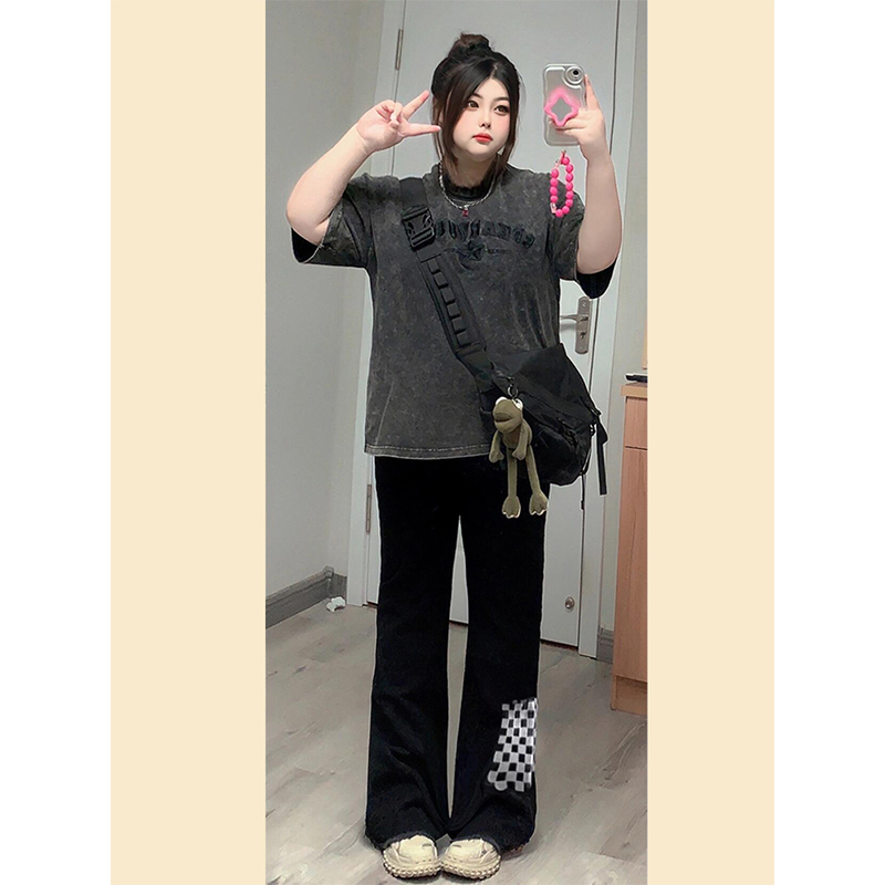 300斤大码女装黑色微喇牛仔裤女胖mm夏季黑色裤子显瘦弹力阔腿裤