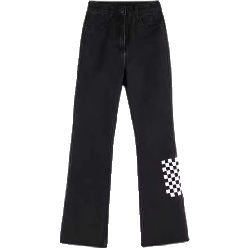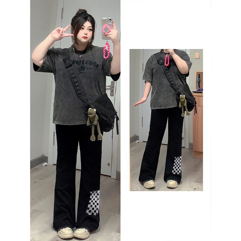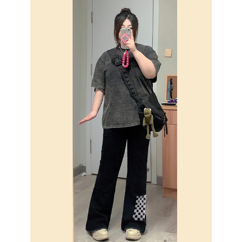 特大码复古ins棋盘格毛边长裤女