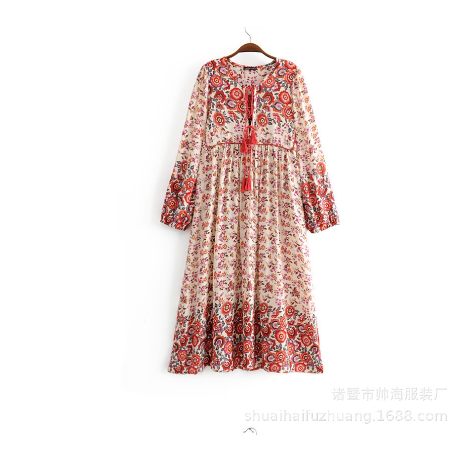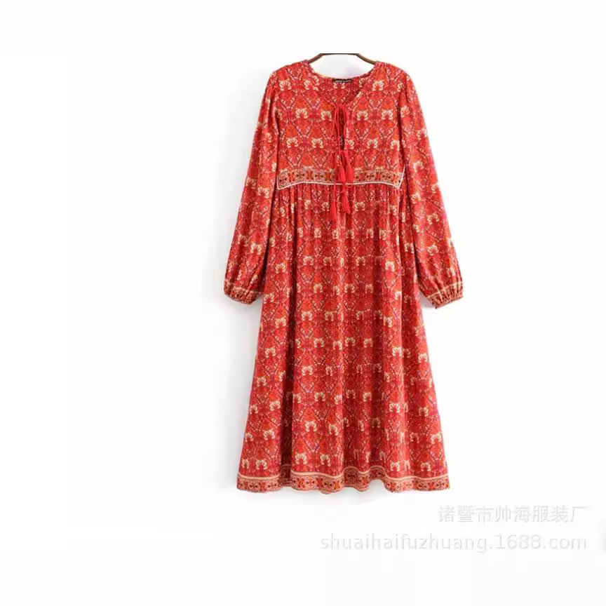 跨境波西米亚流苏欧美新品系带定位大摆连衣裙三款花供选择时尚