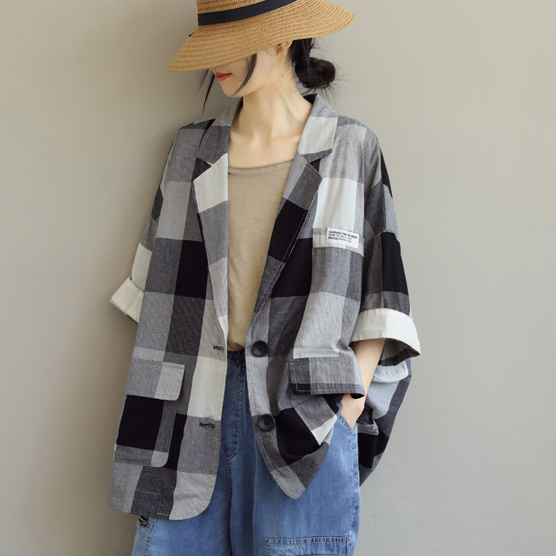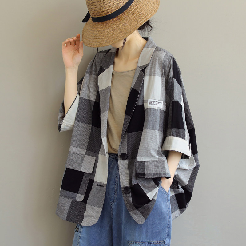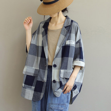 棉麻西装外套女2023夏新款宽松大码显瘦中长款休闲格子半袖上衣薄