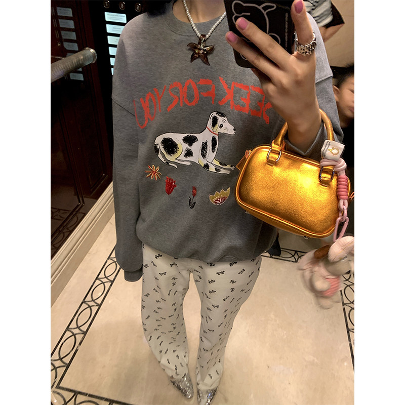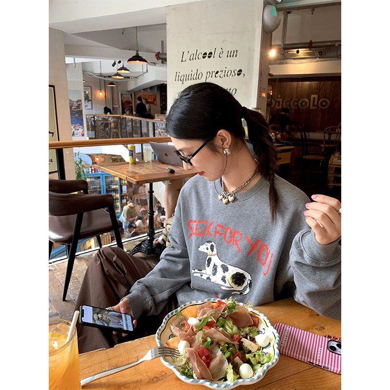 今屿花花美式复古卫衣女春秋款2025新款灰色印花套头长袖宽松纯棉