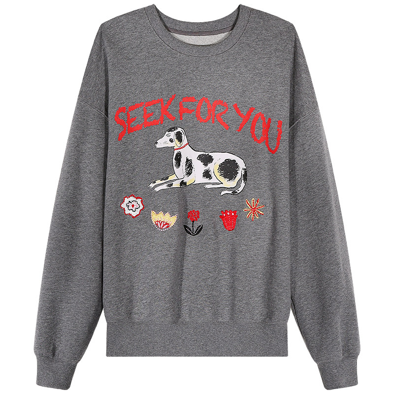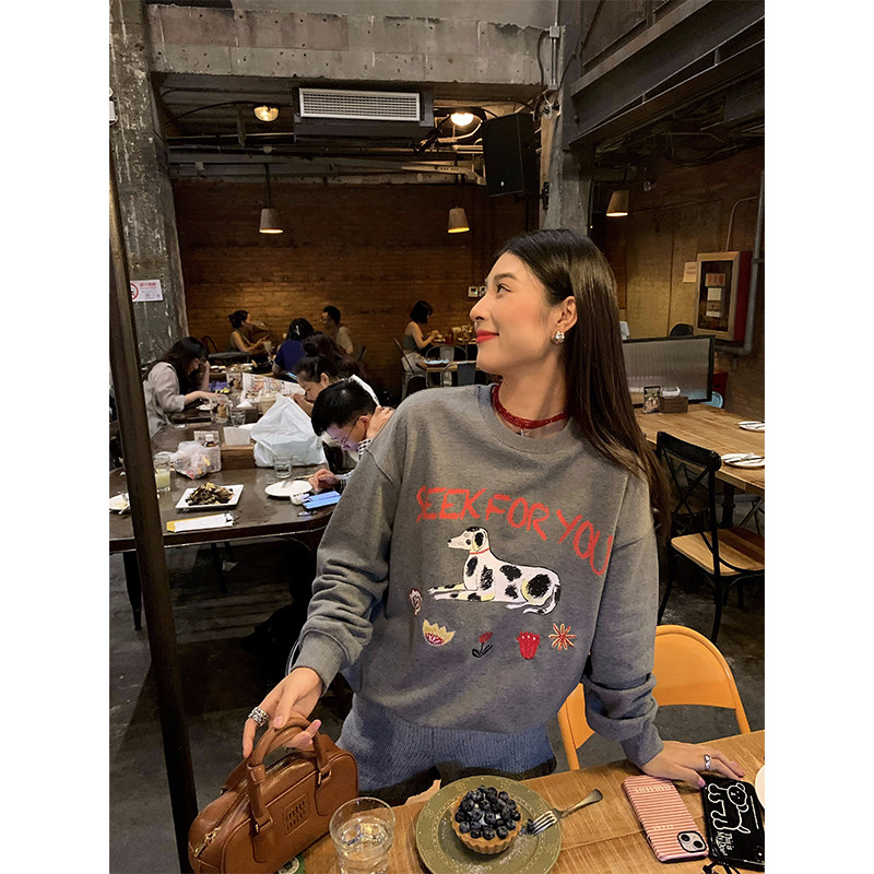 今屿花花灰色印花复古卫衣女春秋
