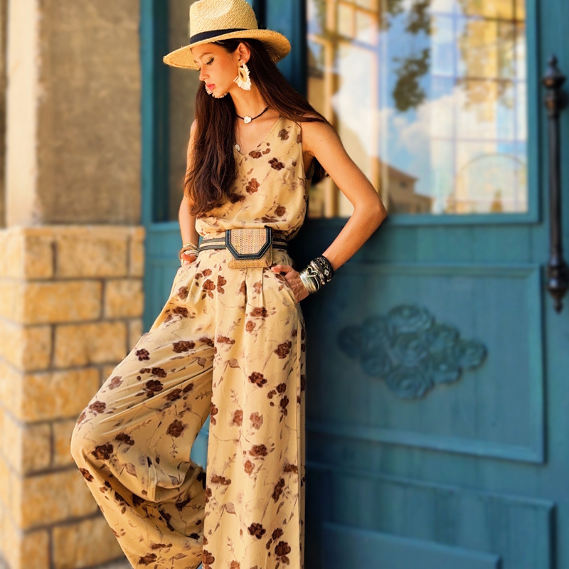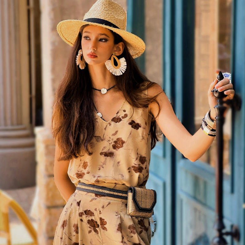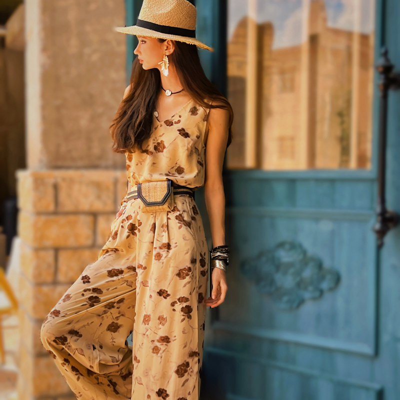 粉红大布娃娃复古浪漫印花套装夏季新款高级感背心拖地阔腿裤女