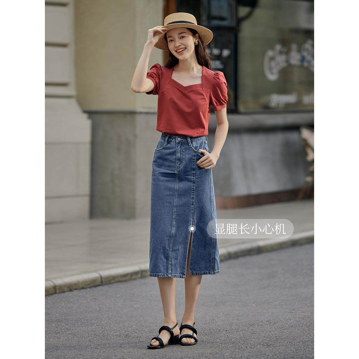 梨涡夏季开叉高腰显瘦牛仔A字裙