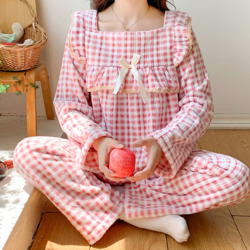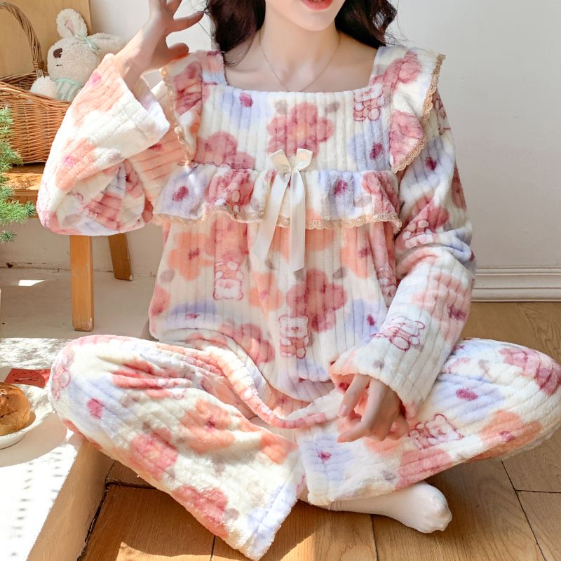 冬季加绒加厚法兰绒睡衣女士公主风方领甜美可爱珊瑚绒家居服套装