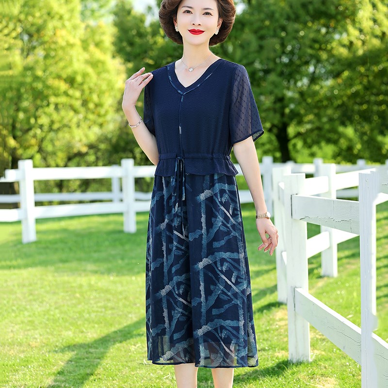 妈妈夏装遮肚连衣裙中年妇女高贵裙子中老年女假两件套短袖真丝裙