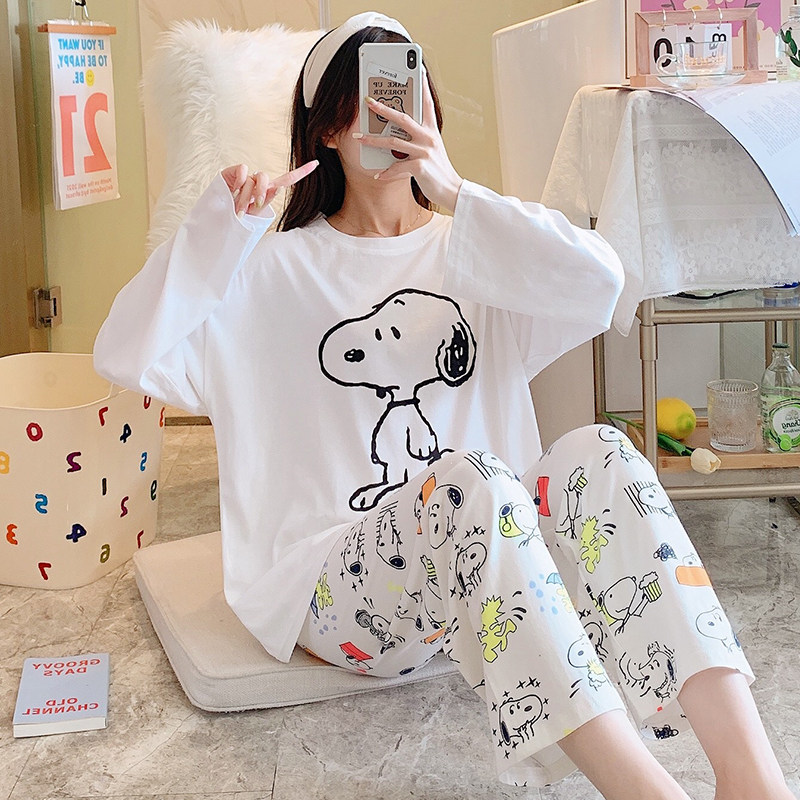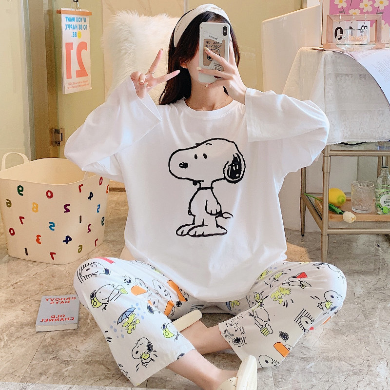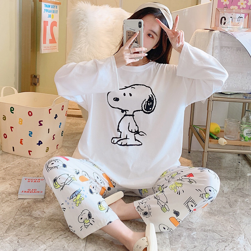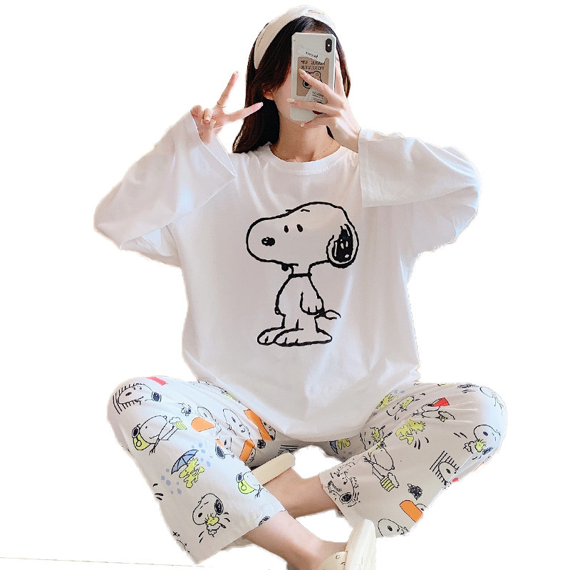 纯棉可爱史努比睡衣女春秋长袖长裤圆领可外穿套装冬天全棉家居服
