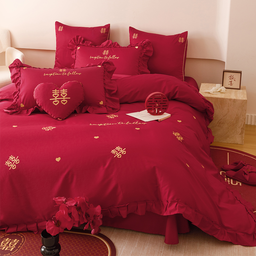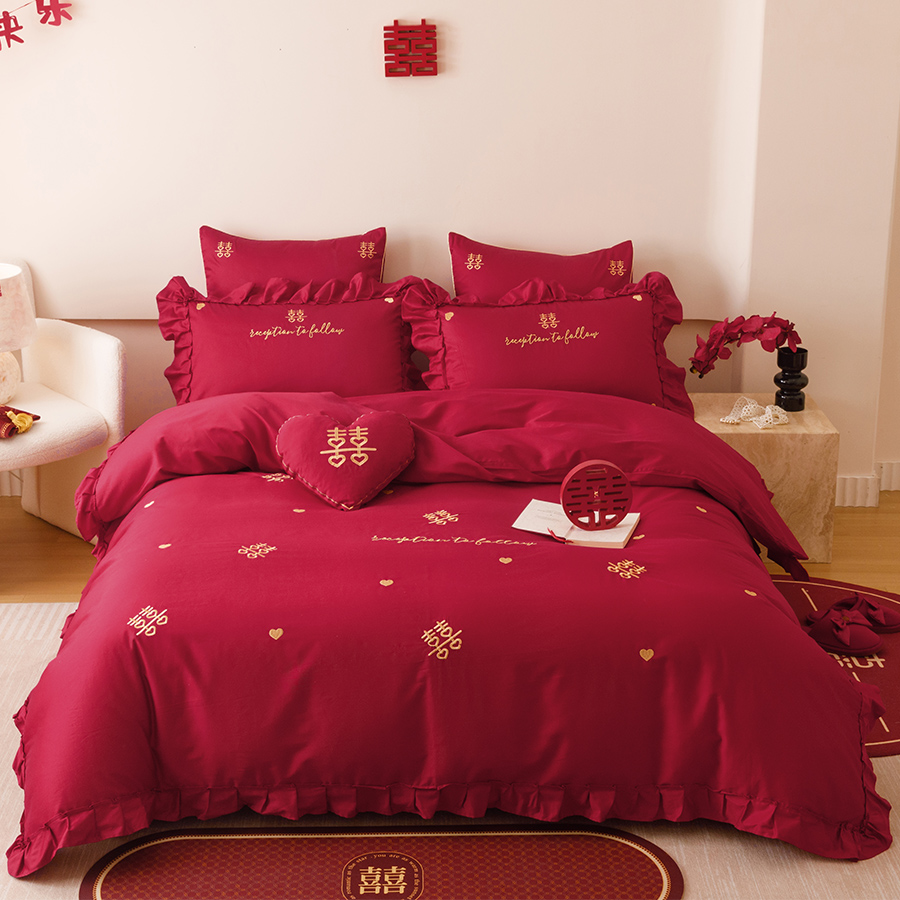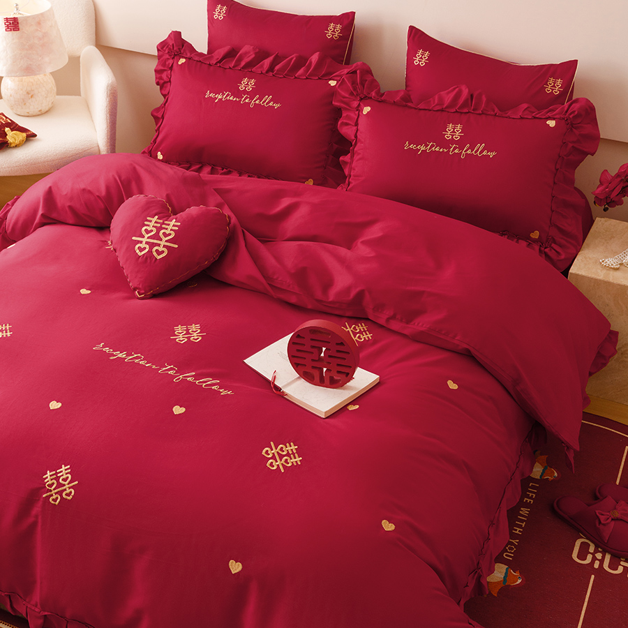 简约中式婚庆四件套全棉小爱心喜字刺绣红色结婚被套床单床笠款