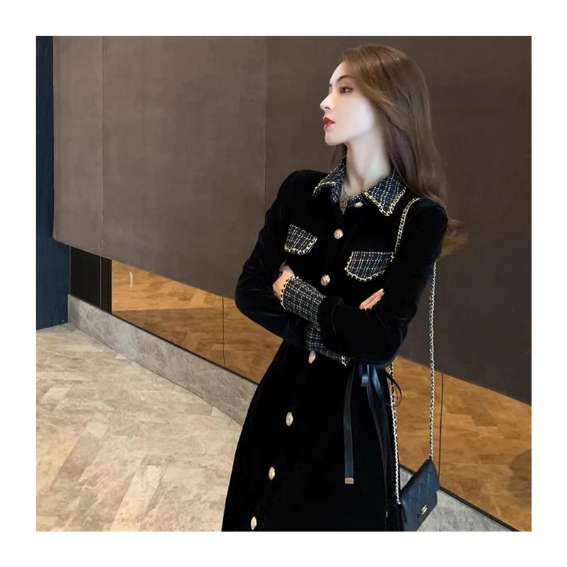 法式小香风名媛气质丝绒连衣裙女春季2025新款收腰显瘦长袖中长裙