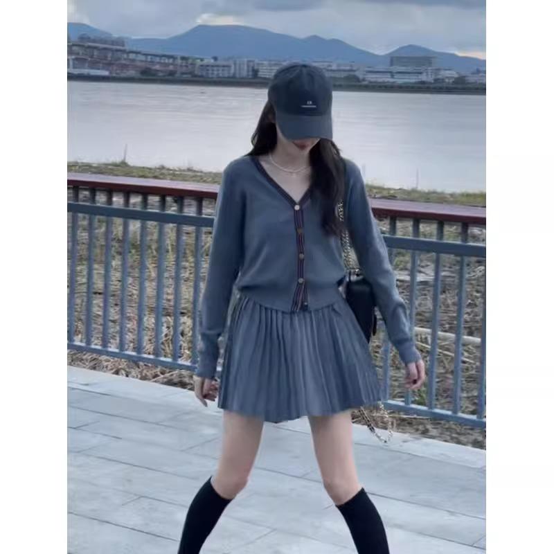 早秋穿搭套装V领撞色边针织开衫外套+灰色针织百褶裙半身裙两件套