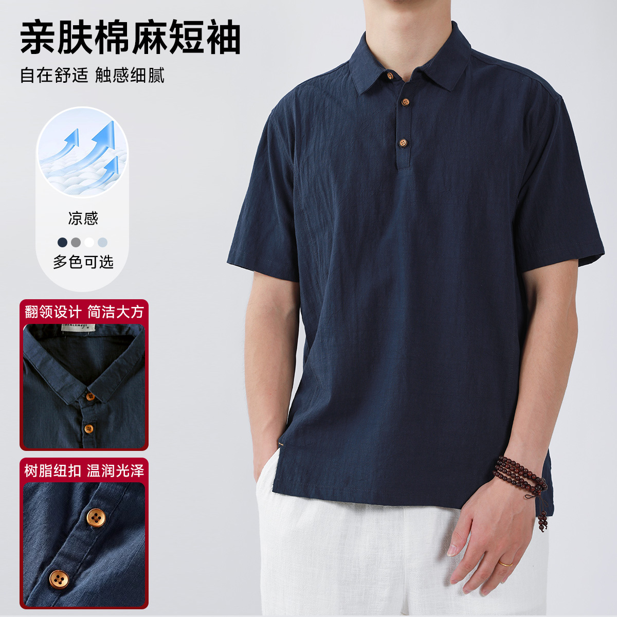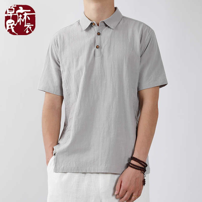 草民麻衣夏秋透气棉亚麻短袖衬衫T恤男中式国风休闲宽松速干polo