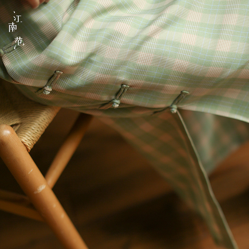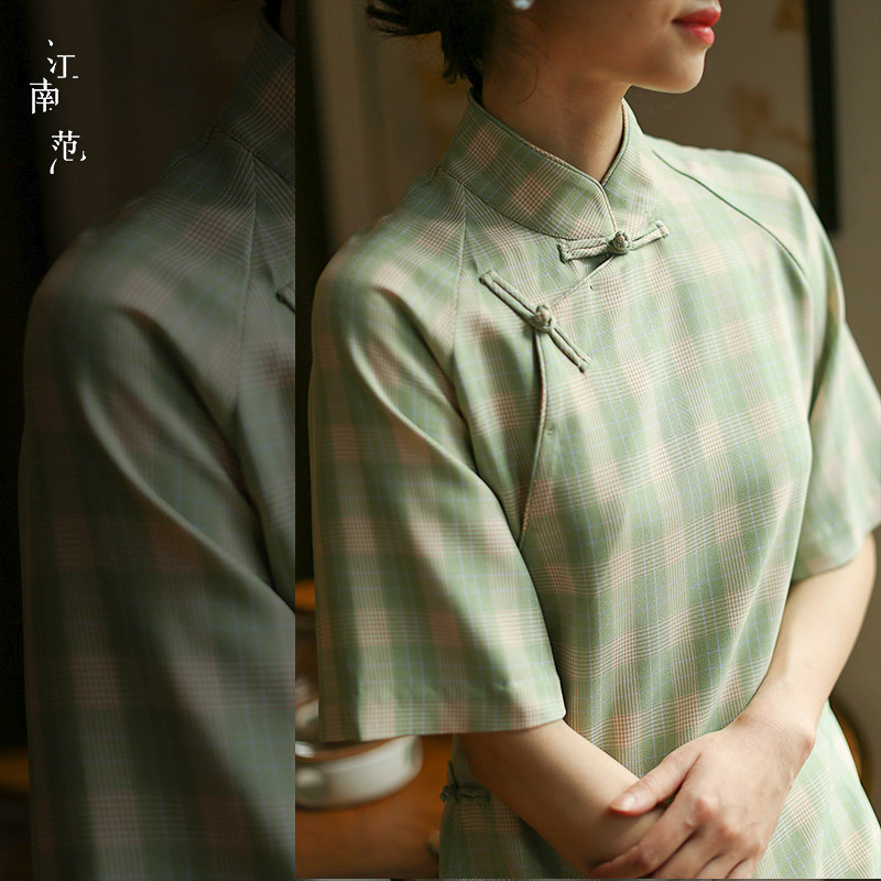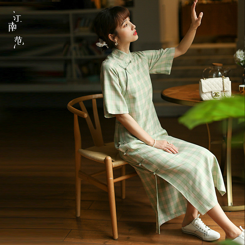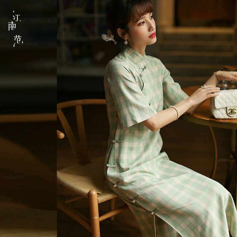 江南范素雅复古少女汉元素收腰旗袍女夏连衣裙日常新款年轻款格纹