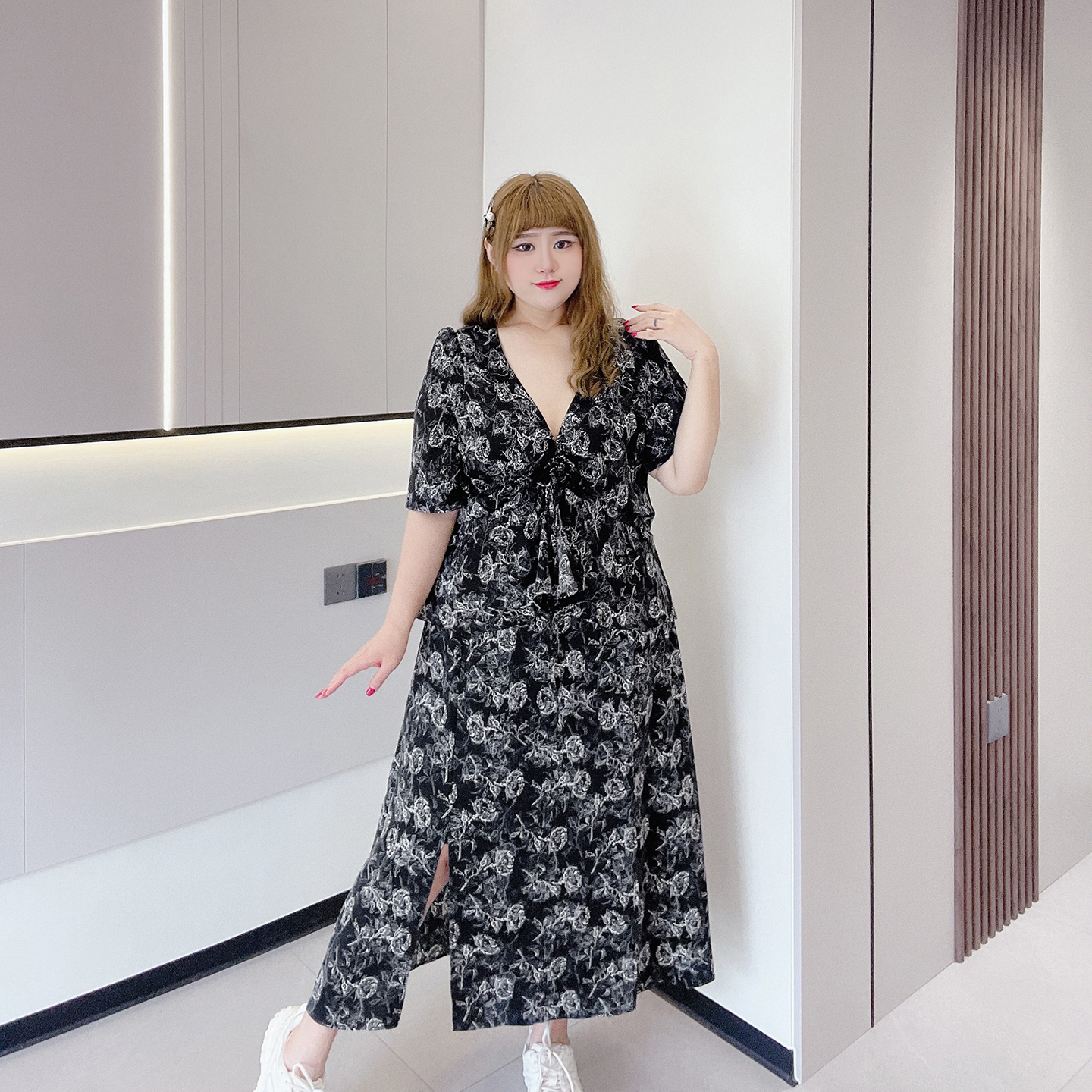 300斤显瘦碎花雪纺套装胖莹莹大码女装夏抽褶显瘦衬衫开叉半身裙
