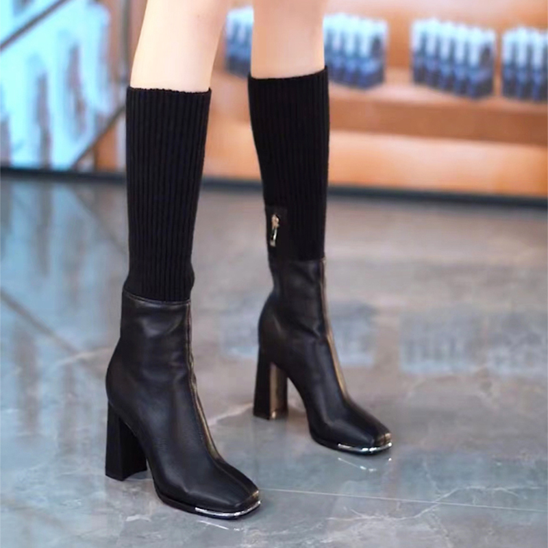 品牌鞋针织弹力马丁靴女2025秋冬新款方头粗跟切尔西高跟真皮短靴