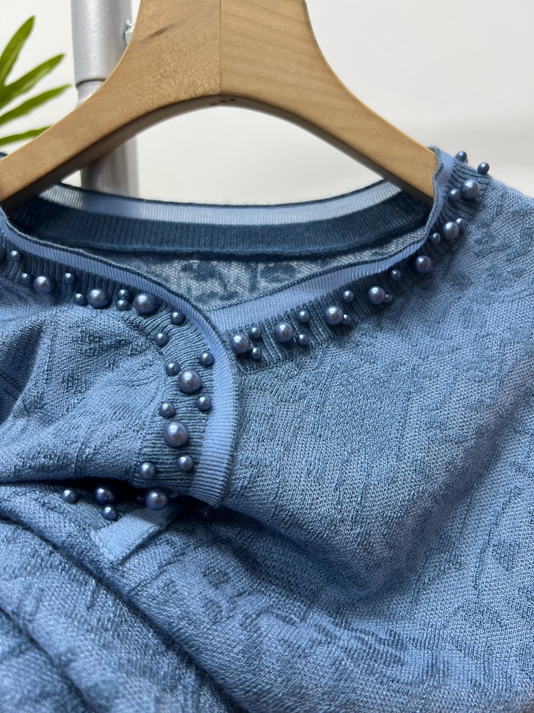 春秋纯色提花钉珠年轻妈妈装套头V领毛衣宽松针织中老年上衣女衫