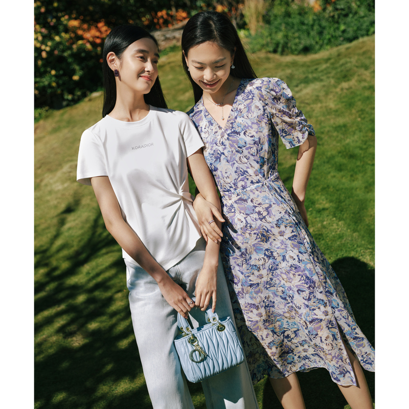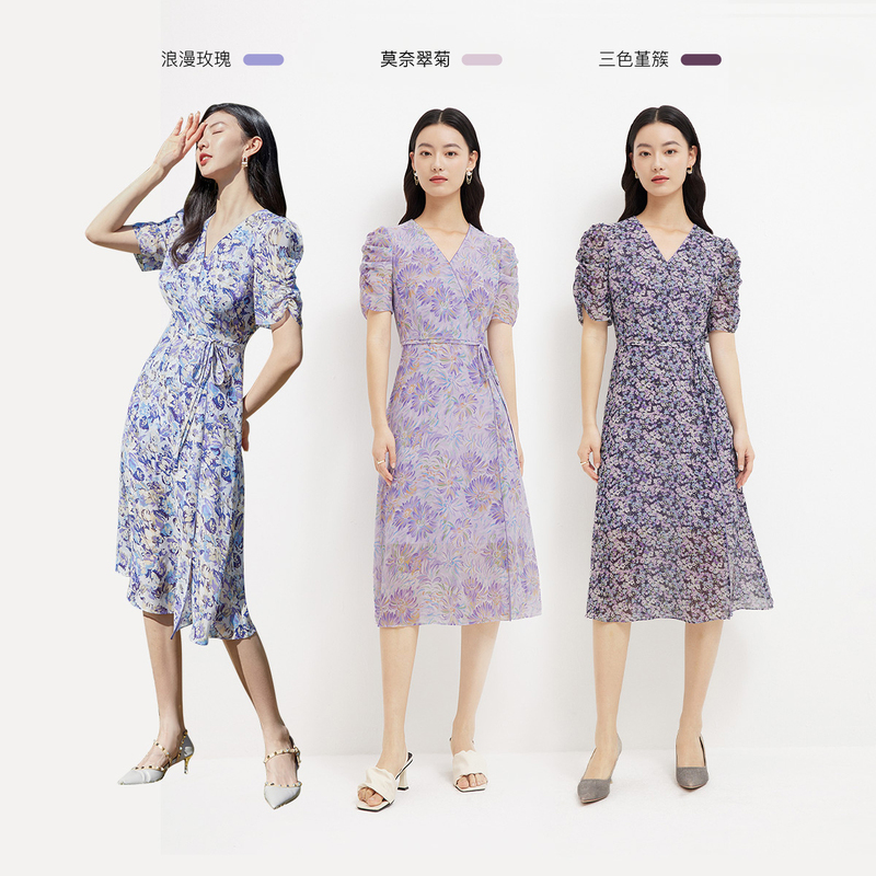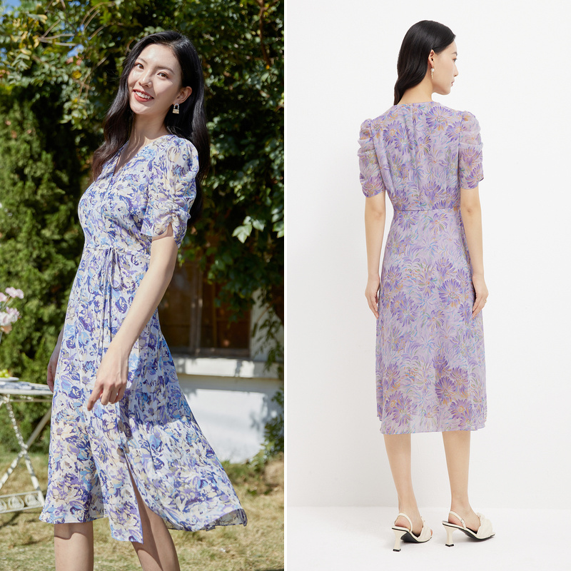 珂莱蒂尔outlets法式V领印花连衣裙女夏泡泡袖法式优雅碎花雪纺裙