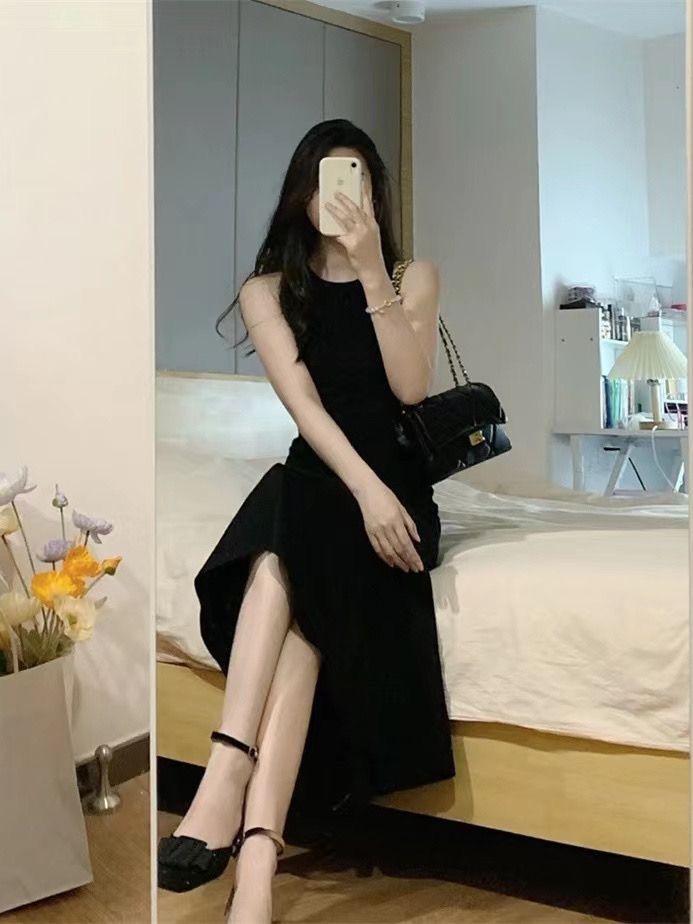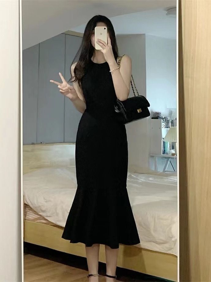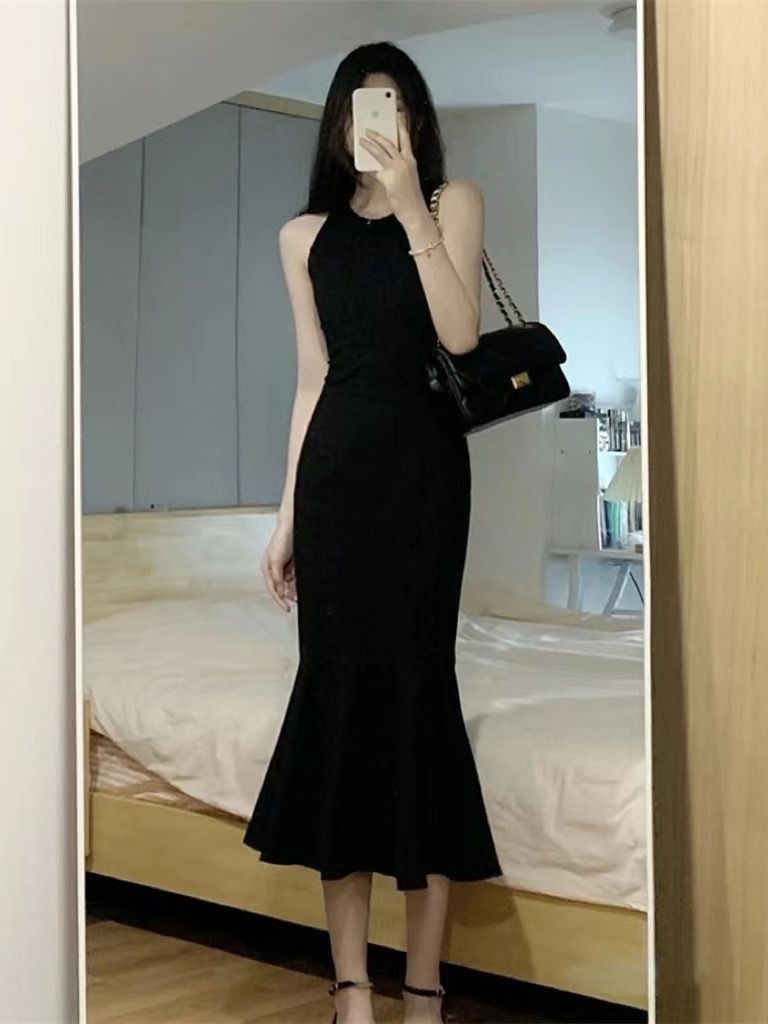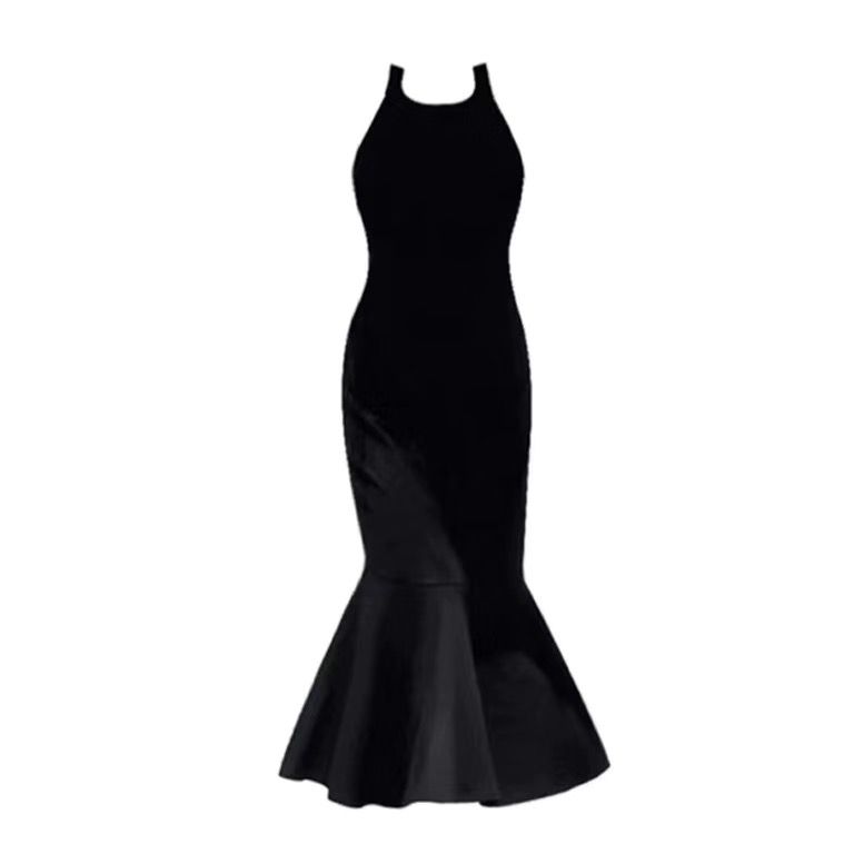 夏季黑色性感露背吊带连衣裙女外穿无袖背心裙子收腰包臀鱼尾长裙