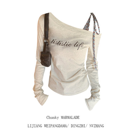 大码胖mm设计感格子绑带斜肩长袖t恤女早秋韩系修身显瘦百搭上衣