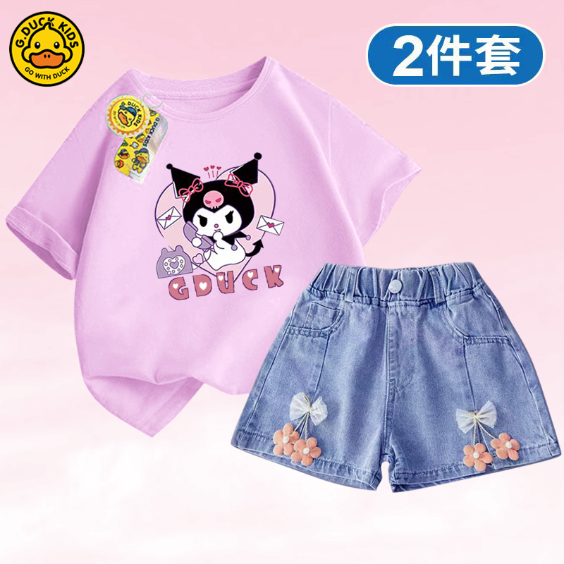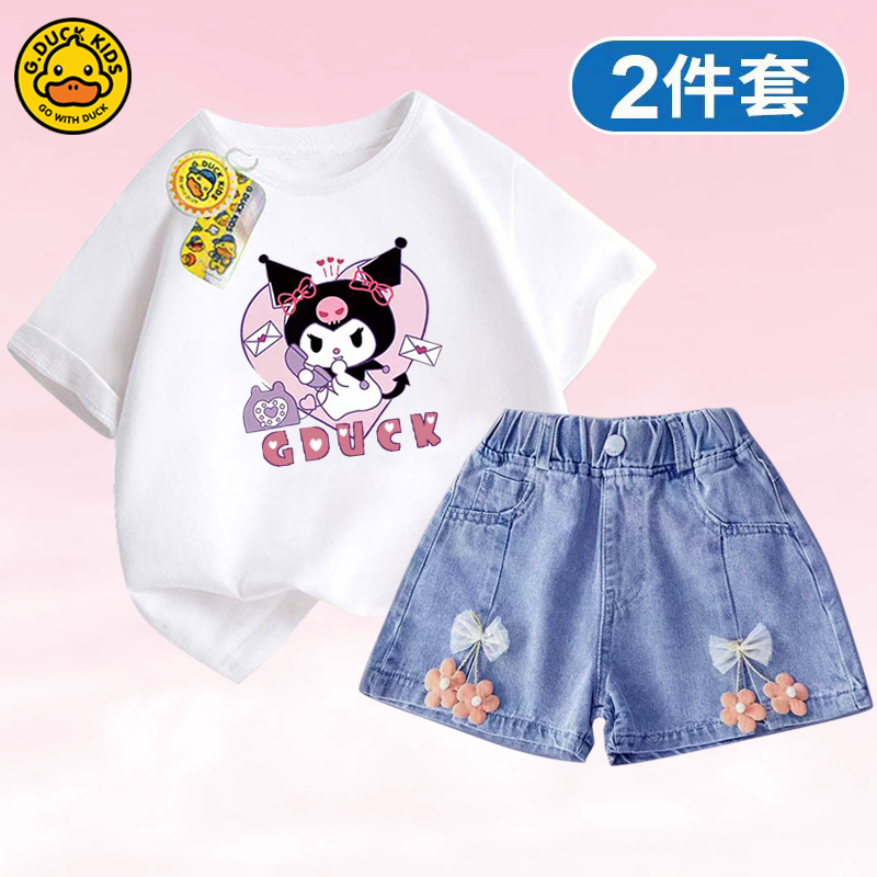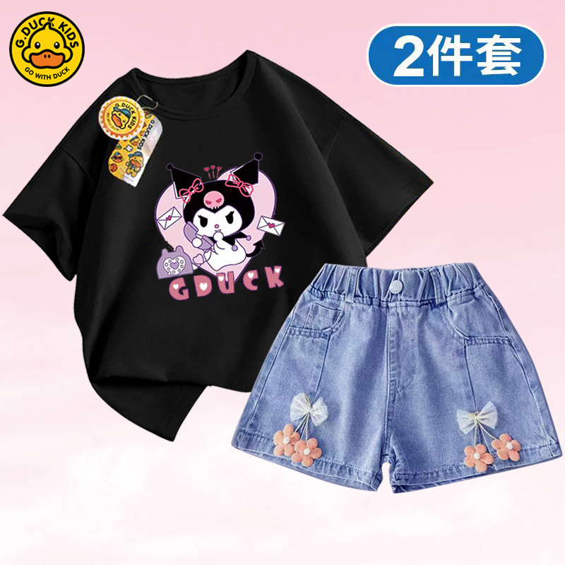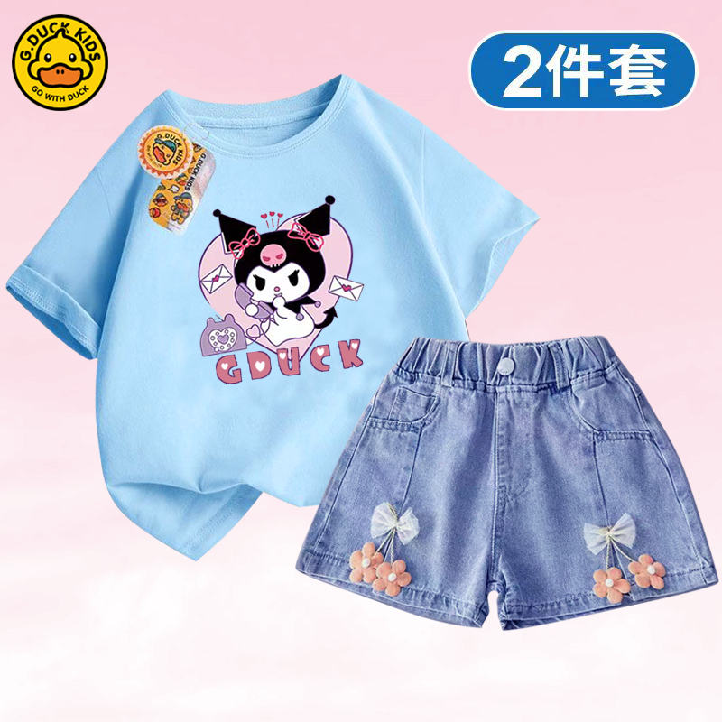 小黄鸭女童夏装套装2025新款纯棉短袖时尚大童百搭牛仔短裙两件套