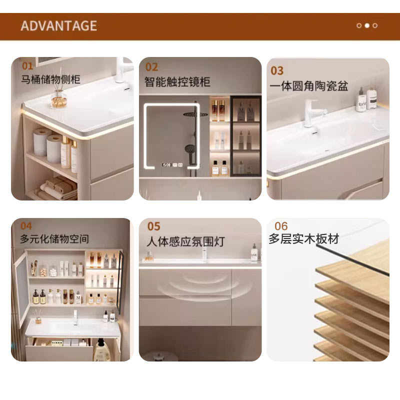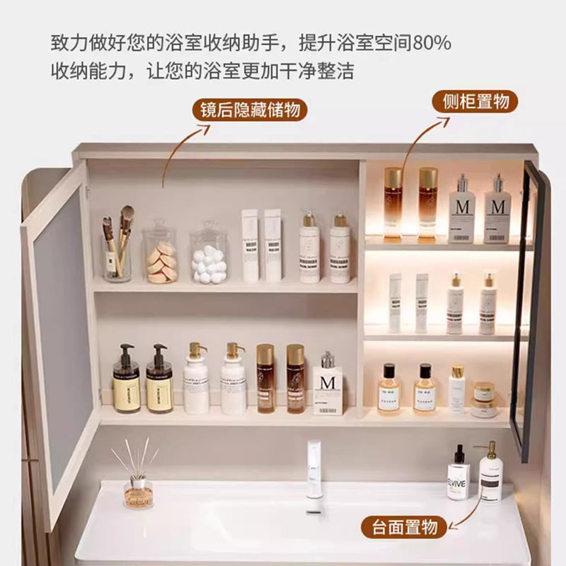 现代奶油风洗手台洗漱台浴室柜组合圆角陶瓷一体侧边收纳柜洗脸盆