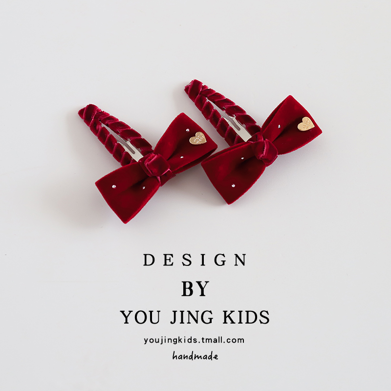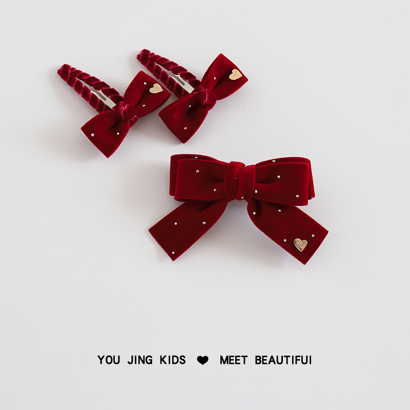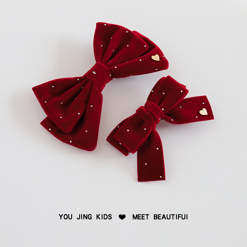 儿童红色丝绒发夹女童蝴蝶结新年头饰女孩节日过年发卡刘海夹发饰