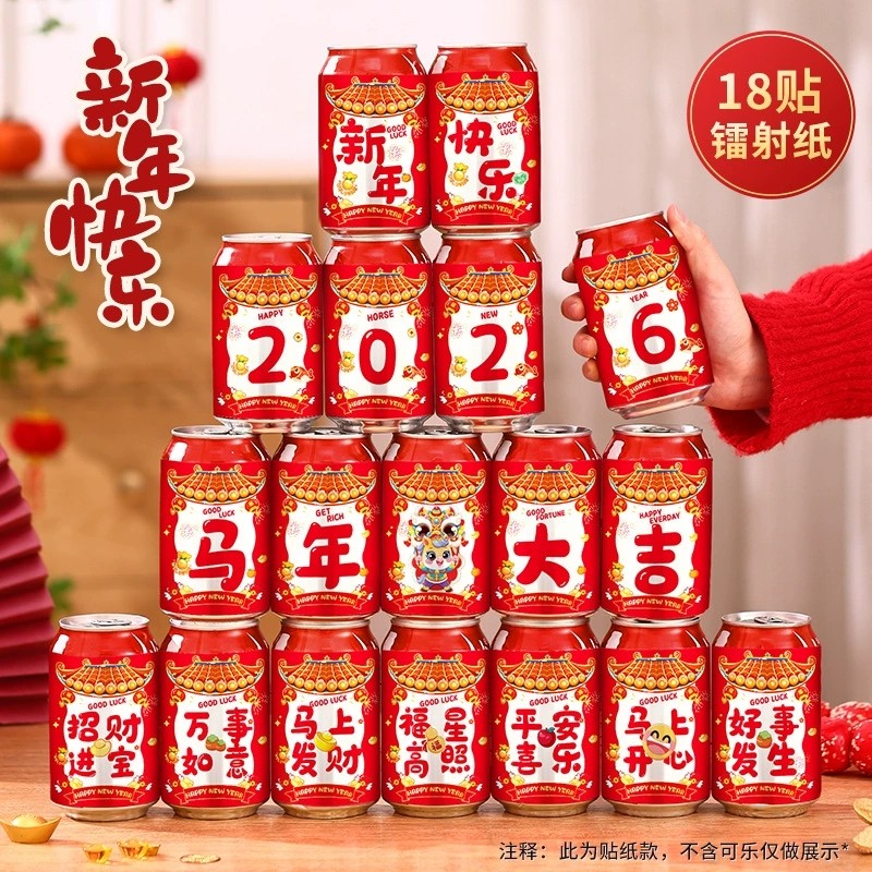 马年创意可乐贴纸2026新款春节氛围场景布置饮料摆件新年快乐不干胶贴年会元旦装饰过年仪式用品道具贴纸C1
