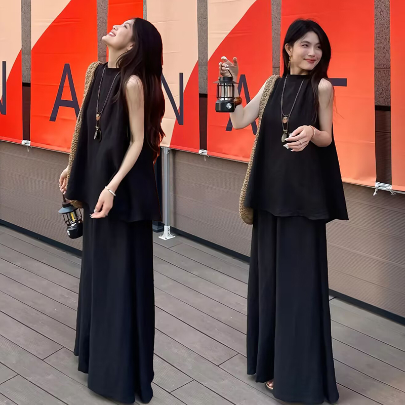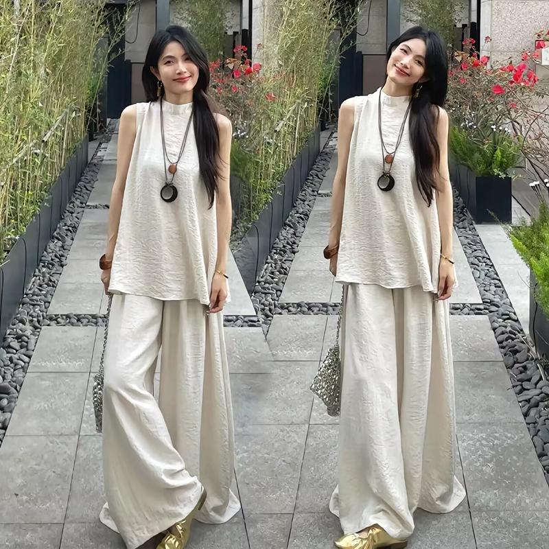 今年流行老钱风套装女夏爆款简约纯色宽松无袖上衣阔腿裙裤两件套