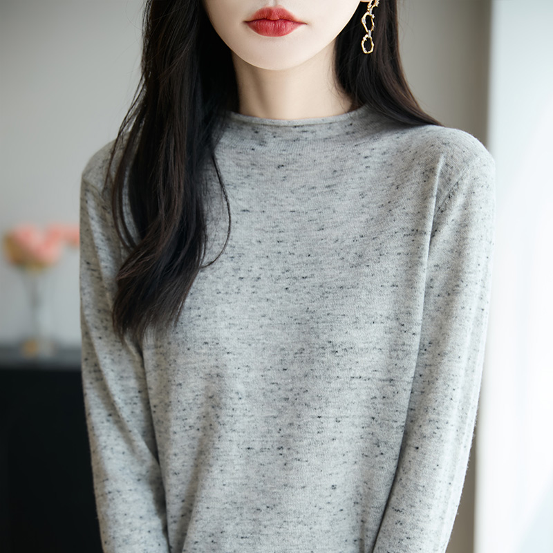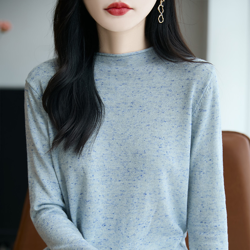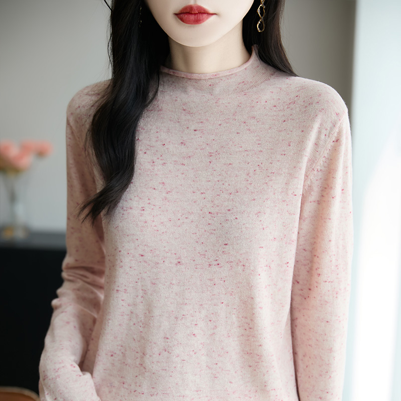 2025秋冬新款卷边半高领针织毛衣女花纱精纺羊毛衫上衣宽松打底衫